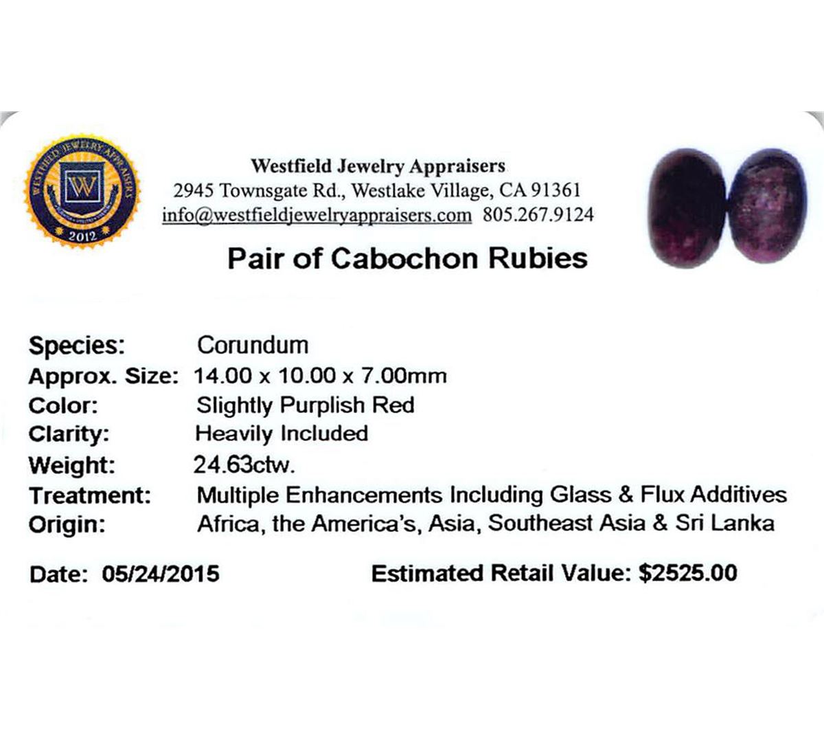 Two oval cabochon cut natural rubies, measuring 14.00 x 10.00 x 7.00mm, exact total weight 24.63ct., clarity is heavily included, type II, dark, very slightly brownish, slightly purplish red color, (GIA slpR 7/3), cut is good. Transmitting light diffusely, opaque. Naturally occurring internal & external characteristics are present. Indications of laboratory high temperature heat treatment, with glass & flux additives. Ruby has a low tolerance to rhodium plating, repolishing the surface, & ultrasonic cleaning. Westfield Appraised at $2,525.00.