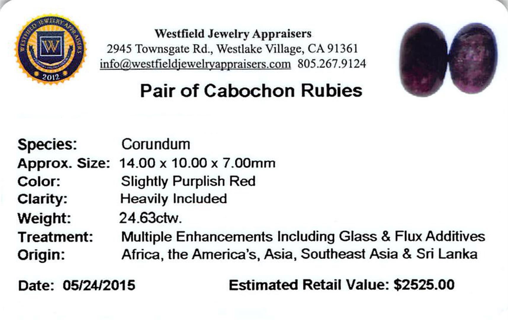 Two oval cabochon cut natural rubies, measuring 14.00 x 10.00 x 7.00mm, exact total weight 24.63ct., clarity is heavily included, type II, dark, very slightly brownish, slightly purplish red color, (GIA slpR 7/3), cut is good. Transmitting light diffusely, opaque. Naturally occurring internal & external characteristics are present. Indications of laboratory high temperature heat treatment, with glass & flux additives. Ruby has a low tolerance to rhodium plating, repolishing the surface, & ultrasonic cleaning. Westfield Appraised.
