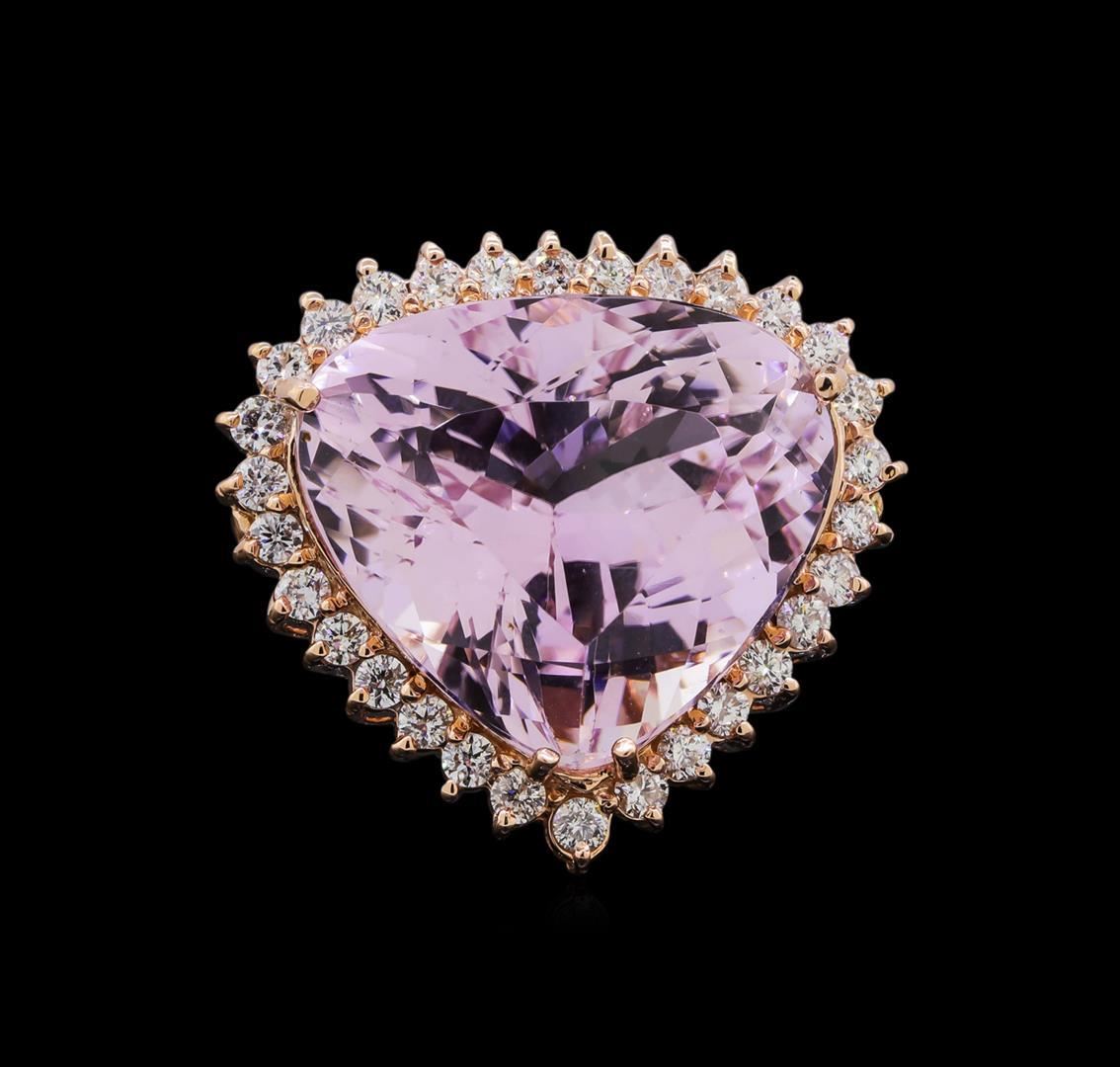 One electronically tested 14KT rose gold lady's cast fashion ring with a basket halo with a bright polish finish. The featured lady's ring has a shank measuring 2.96 millimeters in width. Identified with markings of "14K". Condition is new, good workmanship. Containing: One prong set pear modified brilliant cut natural kunzite, measuring 17.72 x 20.05 x 11.95mm, (depth est.) approximate weight of 24.70 ct., clarity is eye clean, light, moderately strong, purple red color, (GIA PR 3/4), cut is very good. Transmitting light with no distortion, transparent. Colored gemstones are presumed to have been subjected to commonly used enhancement processes. Graded in the setting. Thirty prong set round brilliant cut diamonds, measuring 2.00 - 1.95 x 1.25mm (depth est.) approximate total weight of 30 Stones = 0.98ct. Graded in the setting. Clarity: SI-1 to SI-2. Color: H - I. Cut Good. Total Weight of Colored Stones 24.70 ct. Total Weight of Diamonds 0.98ct. Total Weight of Ring 12.80gm. GAS Appraised.