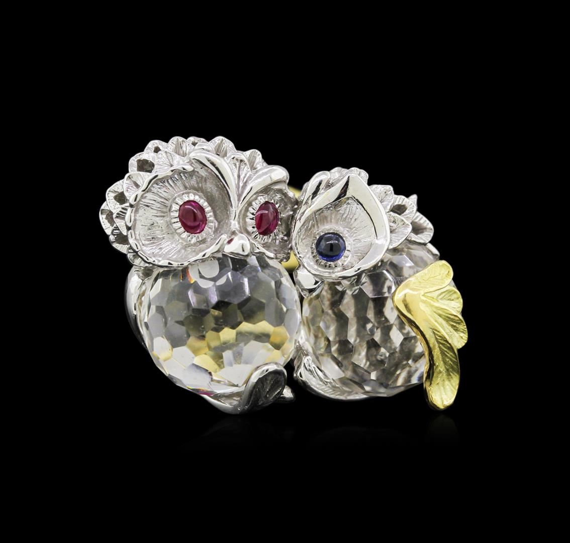 One electronically tested 18KT white and yellow gold lady's combination cast & assembled ring with a bright polish with satin shank finish. The featured ladies ring has a double owl motif, with a hinged bamboo, satin finished split shank, that measures 6.8mm wide. Identified with markings of "K18". Condition is new, good workmanship. Containing: Two illusion set briolette modified step cut natural white topazes, measuring 12.00 x 12.00 x 7.80mm, approximate total weight of 24.78ct., clarity is eye clean, colorless, strong, white color, (GIA W 0/5), cut is very good. Transmitting light with no distortion, transparent. Graded in the setting. Twenty bezel set oval cabochon cut natural rubies, measuring 2.50 x 2.00 x 1.20mm, approximate total weight of 0.18ct., clarity is moderately included, type II, medium dark, moderately strong, red color, (GIA R 6/4), cut is good. Transmitting light somewhat diffusely, transparent to translucent. Graded in the setting. One bezel set round cabochon cut natural blue sapphire, measuring 2.30 x 2.30 x 1.30mm, approximate weight of 0.08ct., clarity is slightly included, type II, medium dark, moderately strong, blue color, (GIA B 6/4), cut is good. Transmitting light with a minimum of distortion, transparent. Graded in the setting. Total Weight of Colored Stones 25.04ct. Total Weight of Ring 17.60gm. GAS Appraised at $4,690.00.