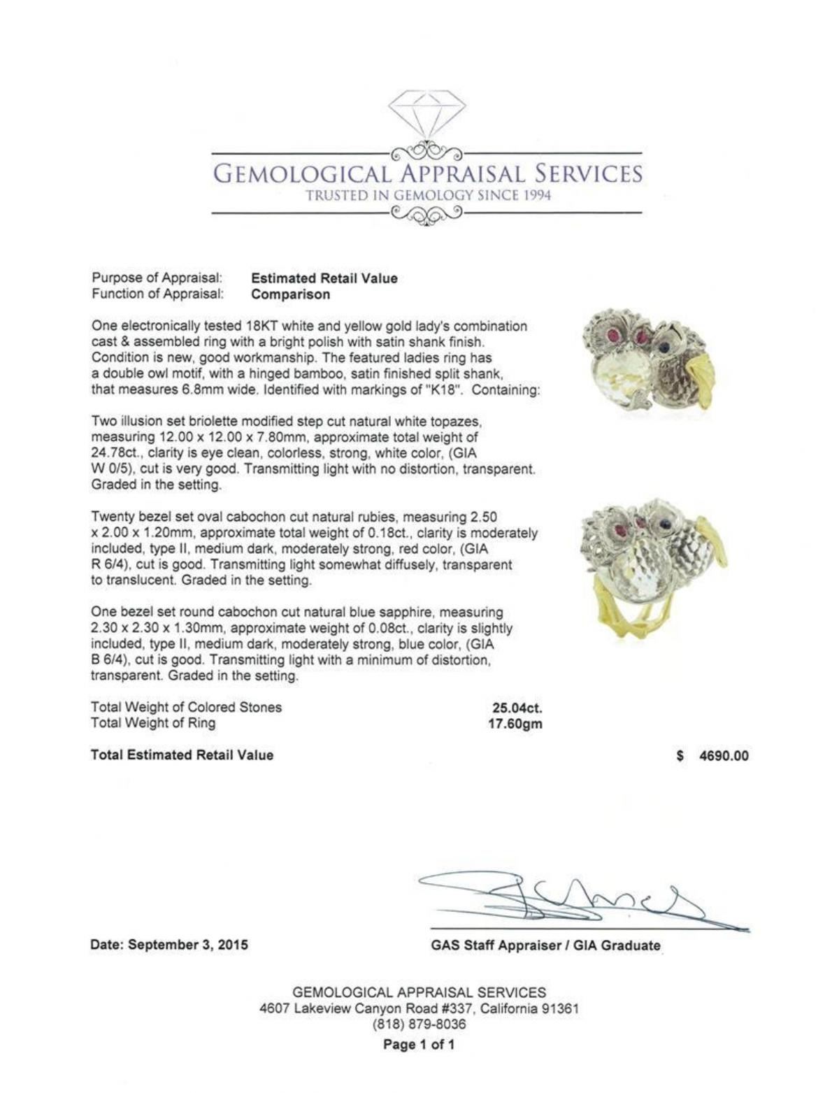 One electronically tested 18KT white and yellow gold lady's combination cast & assembled ring with a bright polish with satin shank finish. The featured ladies ring has a double owl motif, with a hinged bamboo, satin finished split shank, that measures 6.8mm wide. Identified with markings of "K18". Condition is new, good workmanship. Containing: Two illusion set briolette modified step cut natural white topazes, measuring 12.00 x 12.00 x 7.80mm, approximate total weight of 24.78ct., clarity is eye clean, colorless, strong, white color, (GIA W 0/5), cut is very good. Transmitting light with no distortion, transparent. Graded in the setting. Twenty bezel set oval cabochon cut natural rubies, measuring 2.50 x 2.00 x 1.20mm, approximate total weight of 0.18ct., clarity is moderately included, type II, medium dark, moderately strong, red color, (GIA R 6/4), cut is good. Transmitting light somewhat diffusely, transparent to translucent. Graded in the setting. One bezel set round cabochon cut natural blue sapphire, measuring 2.30 x 2.30 x 1.30mm, approximate weight of 0.08ct., clarity is slightly included, type II, medium dark, moderately strong, blue color, (GIA B 6/4), cut is good. Transmitting light with a minimum of distortion, transparent. Graded in the setting. Total Weight of Colored Stones 25.04ct. Total Weight of Ring 17.60gm. GAS Appraised.