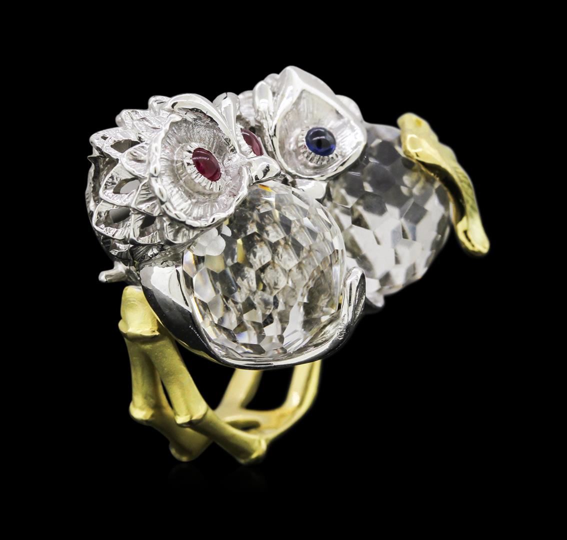 One electronically tested 18KT white and yellow gold lady's combination cast & assembled ring with a bright polish with satin shank finish. The featured ladies ring has a double owl motif, with a hinged bamboo, satin finished split shank, that measures 6.8mm wide. Identified with markings of "K18". Condition is new, good workmanship. Containing: Two illusion set briolette modified step cut natural white topazes, measuring 12.00 x 12.00 x 7.80mm, approximate total weight of 24.78ct., clarity is eye clean, colorless, strong, white color, (GIA W 0/5), cut is very good. Transmitting light with no distortion, transparent. Graded in the setting. Twenty bezel set oval cabochon cut natural rubies, measuring 2.50 x 2.00 x 1.20mm, approximate total weight of 0.18ct., clarity is moderately included, type II, medium dark, moderately strong, red color, (GIA R 6/4), cut is good. Transmitting light somewhat diffusely, transparent to translucent. Graded in the setting. One bezel set round cabochon cut natural blue sapphire, measuring 2.30 x 2.30 x 1.30mm, approximate weight of 0.08ct., clarity is slightly included, type II, medium dark, moderately strong, blue color, (GIA B 6/4), cut is good. Transmitting light with a minimum of distortion, transparent. Graded in the setting. Total Weight of Colored Stones 25.04ct. Total Weight of Ring 17.60gm. GAS Appraised at $4,690.00.