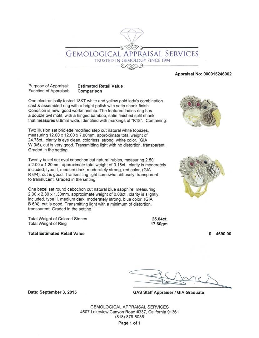 One electronically tested 18KT white and yellow gold lady's combination cast & assembled ring with a bright polish with satin shank finish. The featured ladies ring has a double owl motif, with a hinged bamboo, satin finished split shank, that measures 6.8mm wide. Identified with markings of "K18". Condition is new, good workmanship. Containing: Two illusion set briolette modified step cut natural white topazes, measuring 12.00 x 12.00 x 7.80mm, approximate total weight of 24.78ct., clarity is eye clean, colorless, strong, white color, (GIA W 0/5), cut is very good. Transmitting light with no distortion, transparent. Graded in the setting. Twenty bezel set oval cabochon cut natural rubies, measuring 2.50 x 2.00 x 1.20mm, approximate total weight of 0.18ct., clarity is moderately included, type II, medium dark, moderately strong, red color, (GIA R 6/4), cut is good. Transmitting light somewhat diffusely, transparent to translucent. Graded in the setting. One bezel set round cabochon cut natural blue sapphire, measuring 2.30 x 2.30 x 1.30mm, approximate weight of 0.08ct., clarity is slightly included, type II, medium dark, moderately strong, blue color, (GIA B 6/4), cut is good. Transmitting light with a minimum of distortion, transparent. Graded in the setting. Total Weight of Colored Stones 25.04ct. Total Weight of Ring 17.60gm. GAS Appraised at $4,690.00.