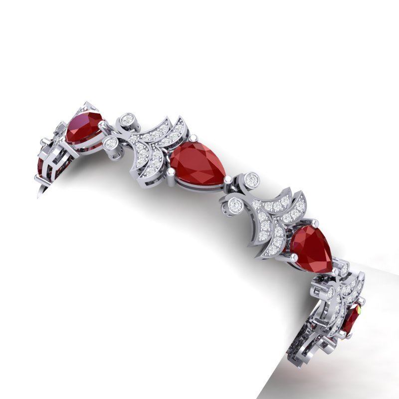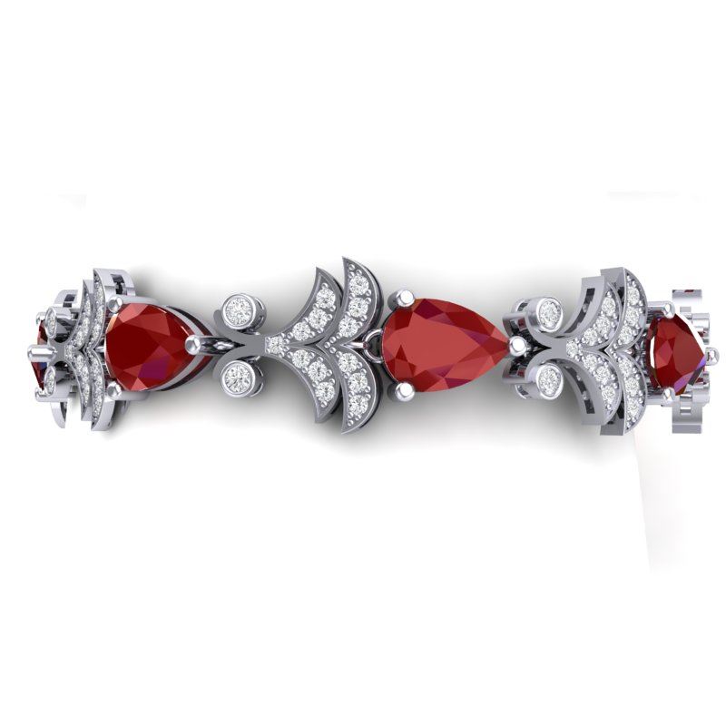 24.8 CTW Royalty Designer Ruby & VS Diamond Bracelet 18K White Gold ---- Luxury Designer Brand Bracelet Appraised Retail Price at $41,600 ---- SKU Number US38733 18K White gold Bracelet Size is 7 Inches, Can custom fit length, Bracelet measuring approx. 1/2 x 7 Inches, weighing in total approx. 25 grams. Made in the USA and is stamped 18K, Main stone 22.25 carat total weight containing 8 pieces of Intense Mid-Opaque Red color with AAA quality Pear shape cut Ruby , Stone #2 2.55 carat total weight containing 120 pieces of G-H color with VS/SI quality Round shape cut