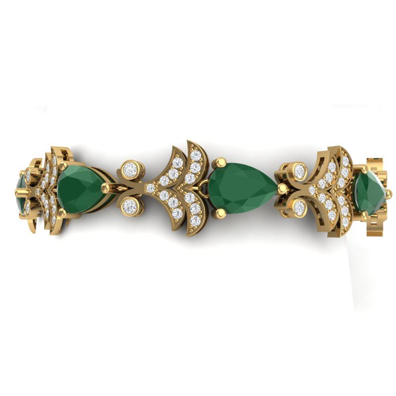 24.8 CTW Royalty Emerald & VS Diamond Bracelet 18K Yellow Gold ---- Luxury Designer Brand Bracelet Appraised Retail Price at $41,600 ---- SKU Number US38732 18K Yellow gold Bracelet Size is 7 Inches, Can custom fit length, Bracelet measuring approx. 1/2 x 7 Inches, weighing in total approx. 25 grams. Made in the USA and is stamped 18K, Main stone 22.25 carat total weight containing 8 pieces of Intense Mid-Opaque Green color with AAA quality Pear shape cut Emerald , Stone #2 2.55 carat total weight containing 120 pieces of G-H color with VS/SI quality Round shape cut