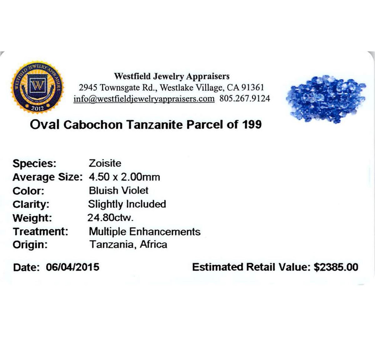 One hundred ninety-nine oval mixed cut natural tanzanites, measuring 4.50 x 2.00 x 1.30mm, exact total weight 24.80ct., clarity is slightly included, type I, medium, very slightly grayish, bluish violet color, (GIA bV 5/3), cut is good. Transmitting light with a minimum of distortion, transparent, Naturally occurring internal & external characteristics are present. Measurements & the color grade are an average for the group. Tanzanite is a very rare gemstone that is only found in the country of Tanzania. Originally discovered in 1967. Tiffany & Company, named the stone Tanzanite. It is found in the Usumburu Mountains that border the Umba Valley of northern Tanzania. Tanzanite occurs in gray, brown, violet, blue, reddish-purple, & green. The gem is interesting because of its exceptional pleochroism. Rotated in different directions a tanzanite will exhibit multiple changes of color. Tanzanite has a low tolerance to ultrasonic cleaning, and should not be cleaned using this method. Westfield Appraised at $2,385.00.