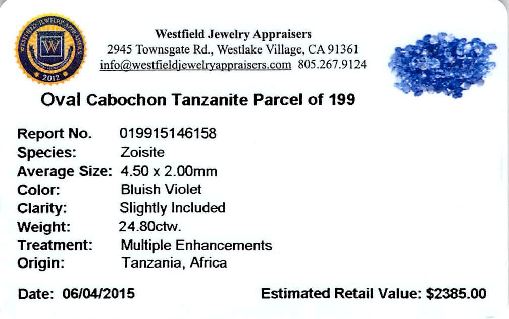 One hundred ninety-nine oval mixed cut natural tanzanites, measuring 4.50 x 2.00 x 1.30mm, exact total weight 24.80ct., clarity is slightly included, type I, medium, very slightly grayish, bluish violet color, (GIA bV 5/3), cut is good. Transmitting light with a minimum of distortion, transparent, Naturally occurring internal & external characteristics are present. Measurements & the color grade are an average for the group. Tanzanite is a very rare gemstone that is only found in the country of Tanzania. Originally discovered in 1967. Tiffany & Company, named the stone Tanzanite. It is found in the Usumburu Mountains that border the Umba Valley of northern Tanzania. Tanzanite occurs in gray, brown, violet, blue, reddish-purple, & green. The gem is interesting because of its exceptional pleochroism. Rotated in different directions a tanzanite will exhibit multiple changes of color. Tanzanite has a low tolerance to ultrasonic cleaning, and should not be cleaned using this method. Westfield Appraised at $2,385.00.