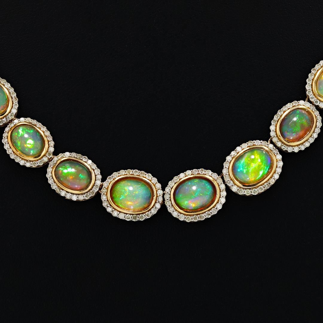 One electronically tested 14KT yellow gold ladies cast and assembled opal and diamond necklace. Condition is new, good workmanship. The seventeen inch length necklace features a flexible graduating ribbon of opals set within diamond bezels, terminating in a concealed clasp with twin safeties. Bright polish finish with rhodium accents. Trademark is Orianne. Identified with markings of "14K". Containing: Thirty-seven prong set oval cabochon cut natural semi crystal opals exact total weight 24.97ct. Each opal has a bright, multicolor play of color (fire) in a flashfire pattern; a medium dome; good cut; no inclusions; consistent in its brightness and pattern; and is slightly directional. Graded in the setting. Eight hundred forty prong set round brilliant cut diamonds exact total weight 840 Stones = 6.00ct. The clarity and color grade reflects the entire range for this group. Graded in the setting. Clarity I-1 to I-3 Color H - M Total Weight of Colored Stones 24.97ct. Total Weight of Diamonds 6.00ct. Total Weight of N ecklace 40.00 gm