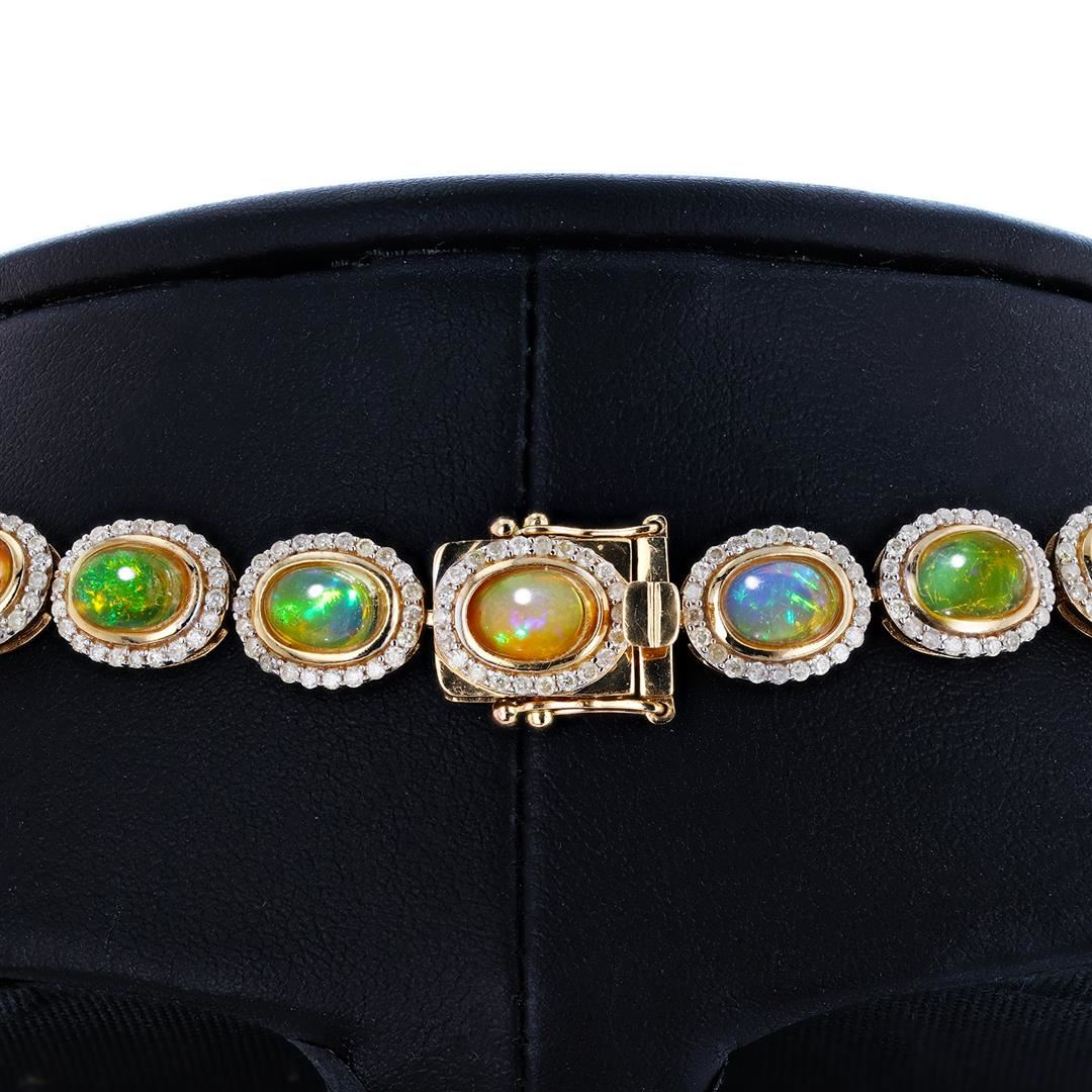One electronically tested 14KT yellow gold ladies cast and assembled opal and diamond necklace. Condition is new, good workmanship. The seventeen inch length necklace features a flexible graduating ribbon of opals set within diamond bezels, terminating in a concealed clasp with twin safeties. Bright polish finish with rhodium accents. Trademark is Orianne. Identified with markings of "14K". Containing: Thirty-seven prong set oval cabochon cut natural semi crystal opals exact total weight 24.97ct. Each opal has a bright, multicolor play of color (fire) in a flashfire pattern; a medium dome; good cut; no inclusions; consistent in its brightness and pattern; and is slightly directional. Graded in the setting. Eight hundred forty prong set round brilliant cut diamonds exact total weight 840 Stones = 6.00ct. The clarity and color grade reflects the entire range for this group. Graded in the setting. Clarity I-1 to I-3 Color H - M Total Weight of Colored Stones 24.97ct. Total Weight of Diamonds 6.00ct. Total Weight of N ecklace 40.00 gm