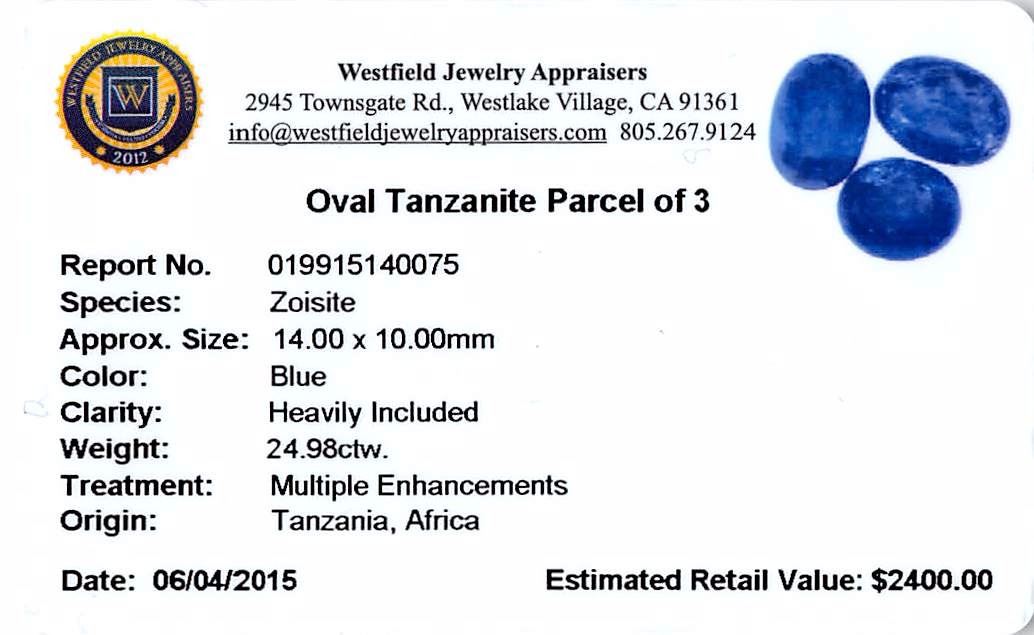 Three oval cut natural Tanzanites, measuring 14.00 x 10.00 x 5.00mm, exact total weight 24.98ct., clarity is heavily included, dark, very slightly grayish, blue color, (GIA B 7/3), cut is good. Measurements are an average for the group. Transmitting light somewhat diffusely, transparent to translucent. Naturally occurring internal & external characteristics are present. Indications of heat treatment. Westfield Appraised at $2,400.00.