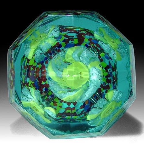 Antique Bohemian faceted bouquet paperweight, with a five spaced yellow and white flowers, growing from a multi-colored cushion, which is encircled by a scalloped white border. All-over geometric facets. Minor surface wear. Height 3 3/8", diameter 3 1/2". NO RESERVE