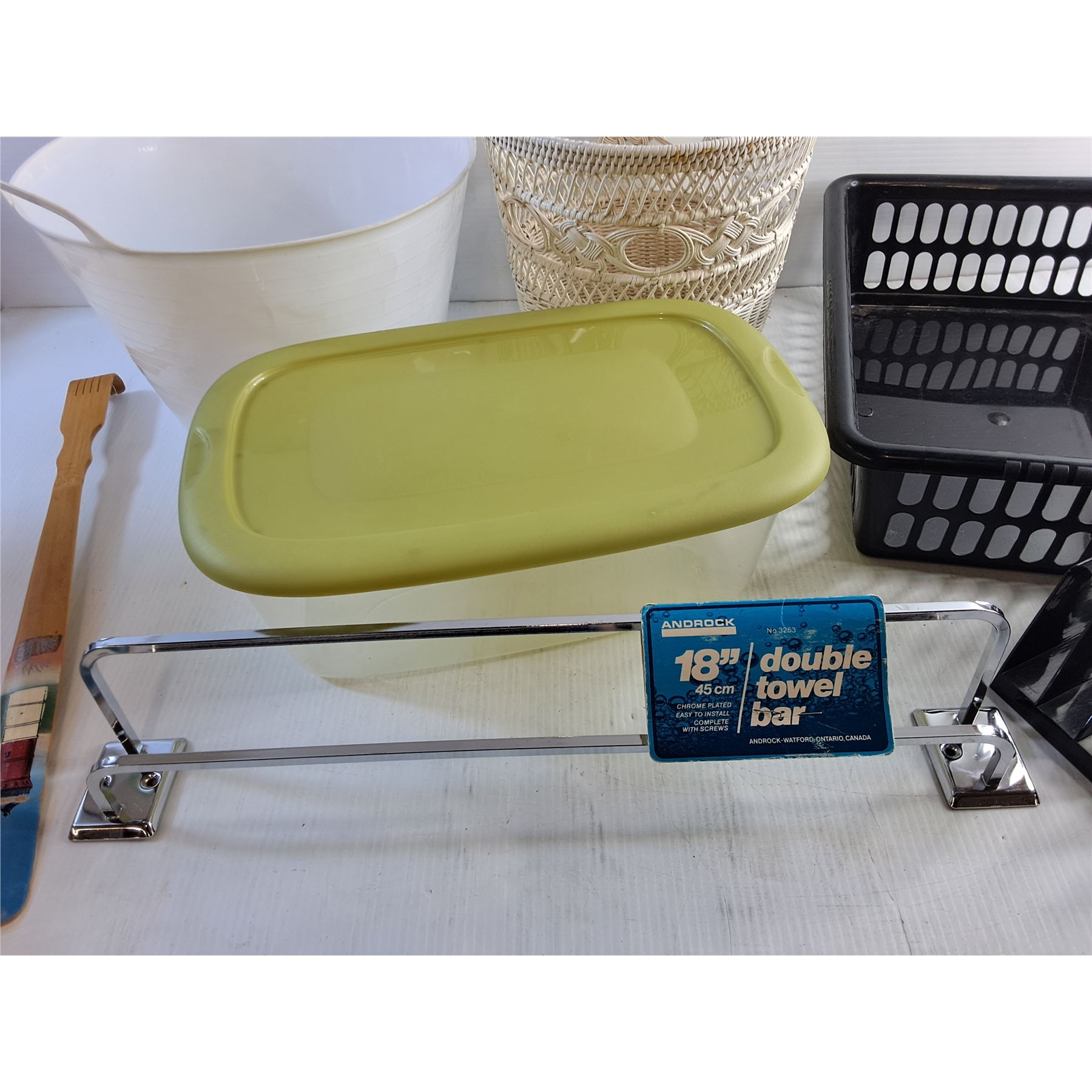 24" Double Towel Bar, Wooden Back Scratcher, Baskets, Container with Lid and Misc