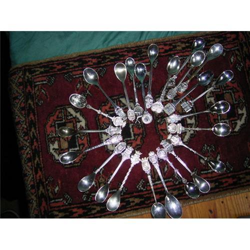 24 silver plated souvenir spoons from Holland.One with the Queen and the Queens mother,12 with arms of diferent towns and provinces from Holland, and 11 other soivenir spoons from Holland.