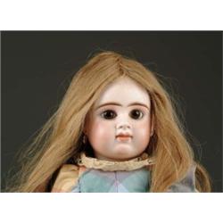 24” E 10 D BEBE. An enchanting French bebe with amber paperweight eyes, pale bisque, and a hint of shadowing above her eyes. This young lady is on a straight wristed marked Jumeau composition body, and has her original sandy blonde human hair wig. Wearing replacement clothing (late 1950’s?) and antique leather shoes. CONDITION: Minute mold flaw in corner of right eye, old repaint to body. JL 1-4517 (1,800-2,200)