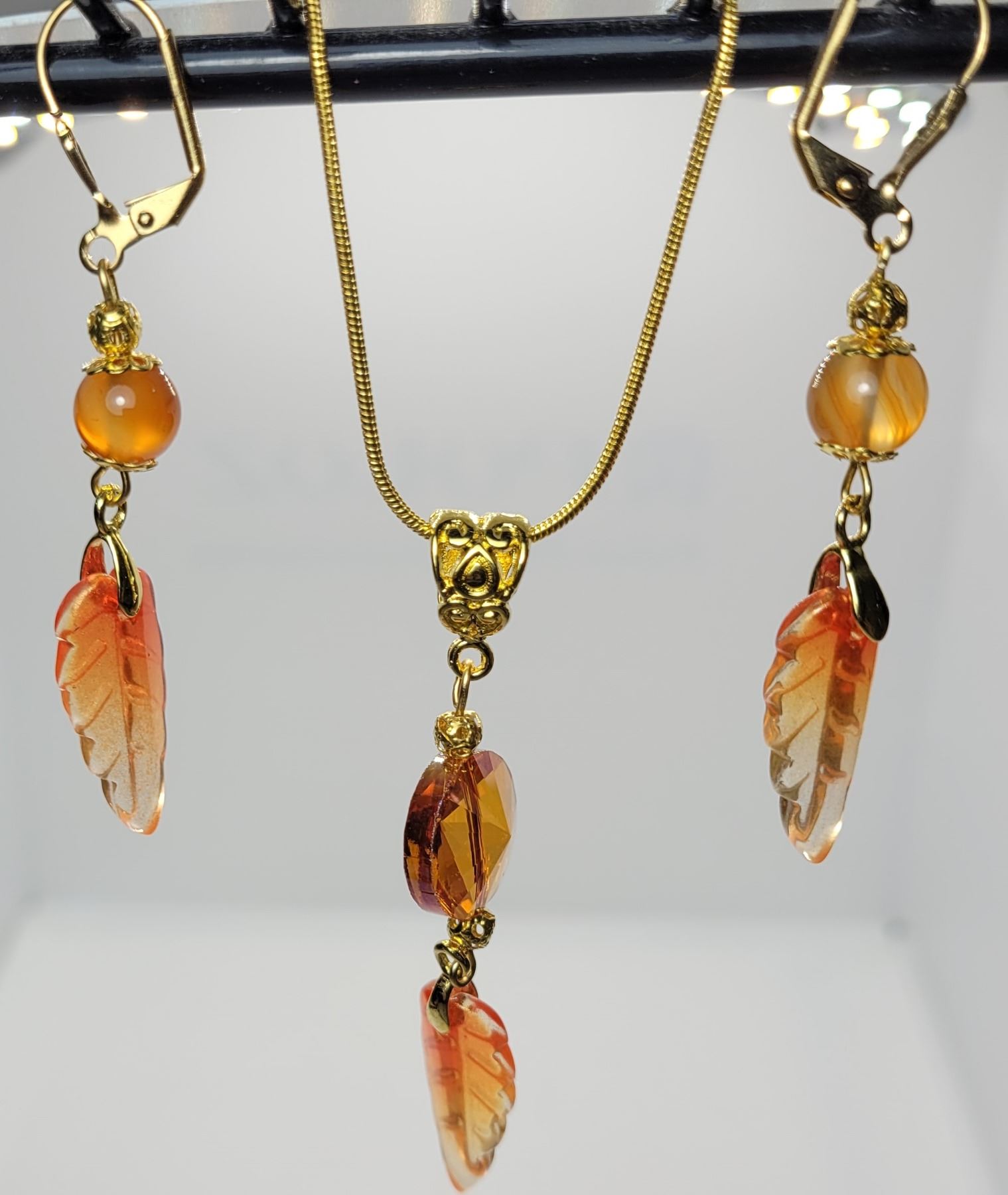 NATURAL CARNELIAN PENDANT AND DROP EARRINGS ON NICKLE FREE GOLD TONE LEVERBACK WIRES. JEWELLERY