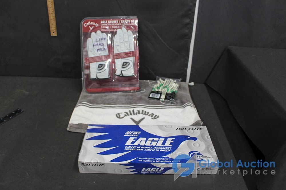 24 Golf Balls (new in box), Tees, Gloves (size M) and Towel