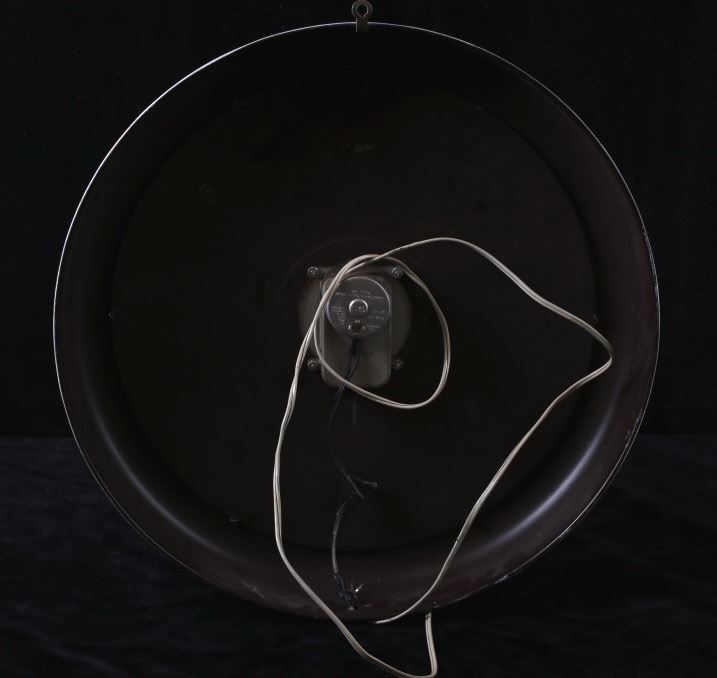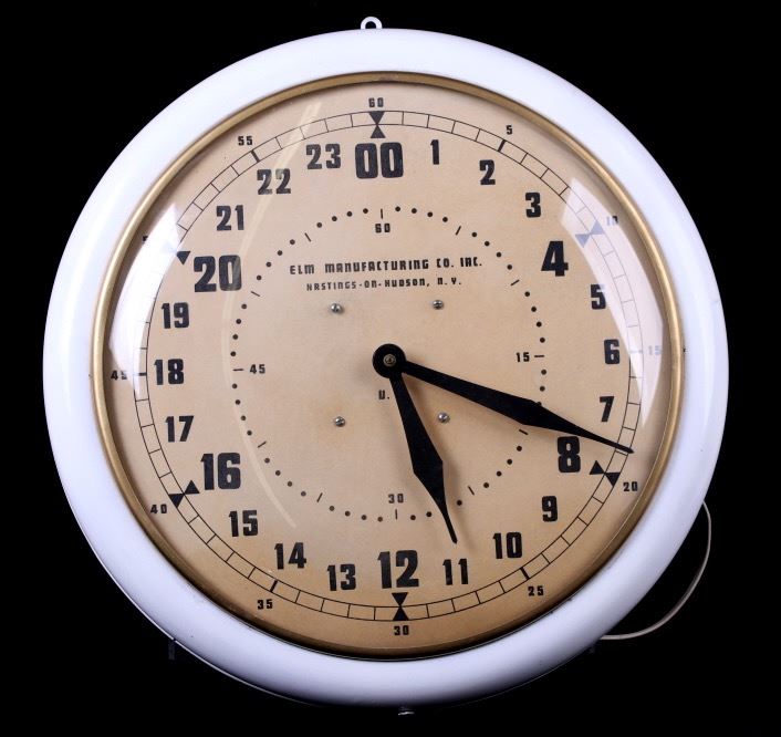 For your bidding pleasure is this 24 Hour Elm Manufacturing Company Inc. Clock. This clock has a white metallic border with a worn beige colored face. The condition of this clock is fair with a two pronged plug that is a little worse off. This clock observes 24hr time period with in between numbering on inside of face and outside of face. This clock has two arms no second hand and is stamped Elm Manufacturing Co. Inc. Hastings-On- Hudson, N.Y. U.S. The measurements of this clock are 18" diameter of clock and 15" diameter for clock face.