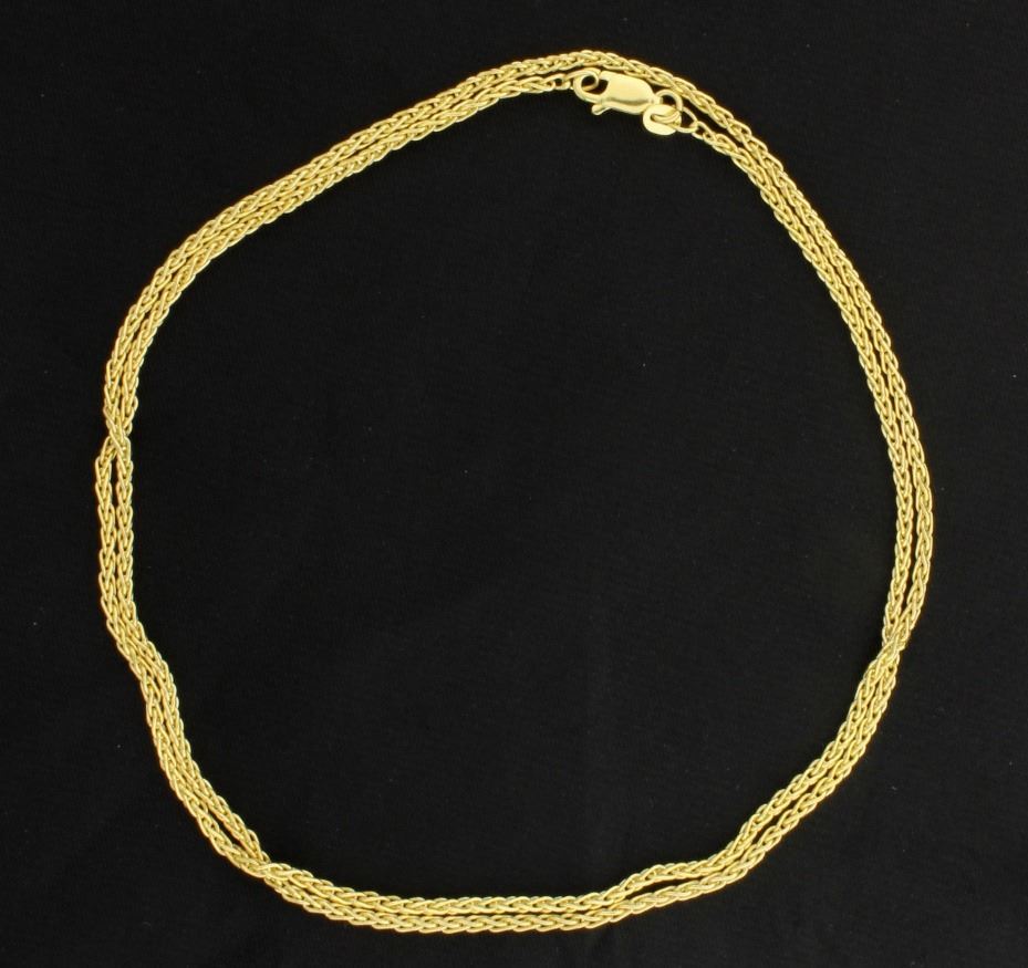 The chain is 14K yellow gold and is 1.5mm wide. It has a lobster clasp. 9.6g