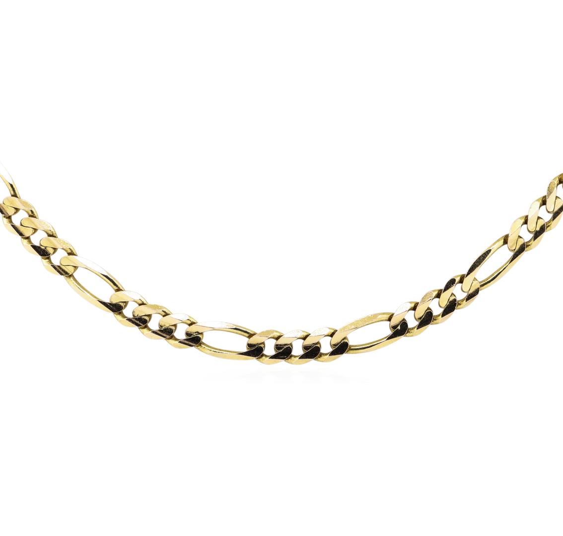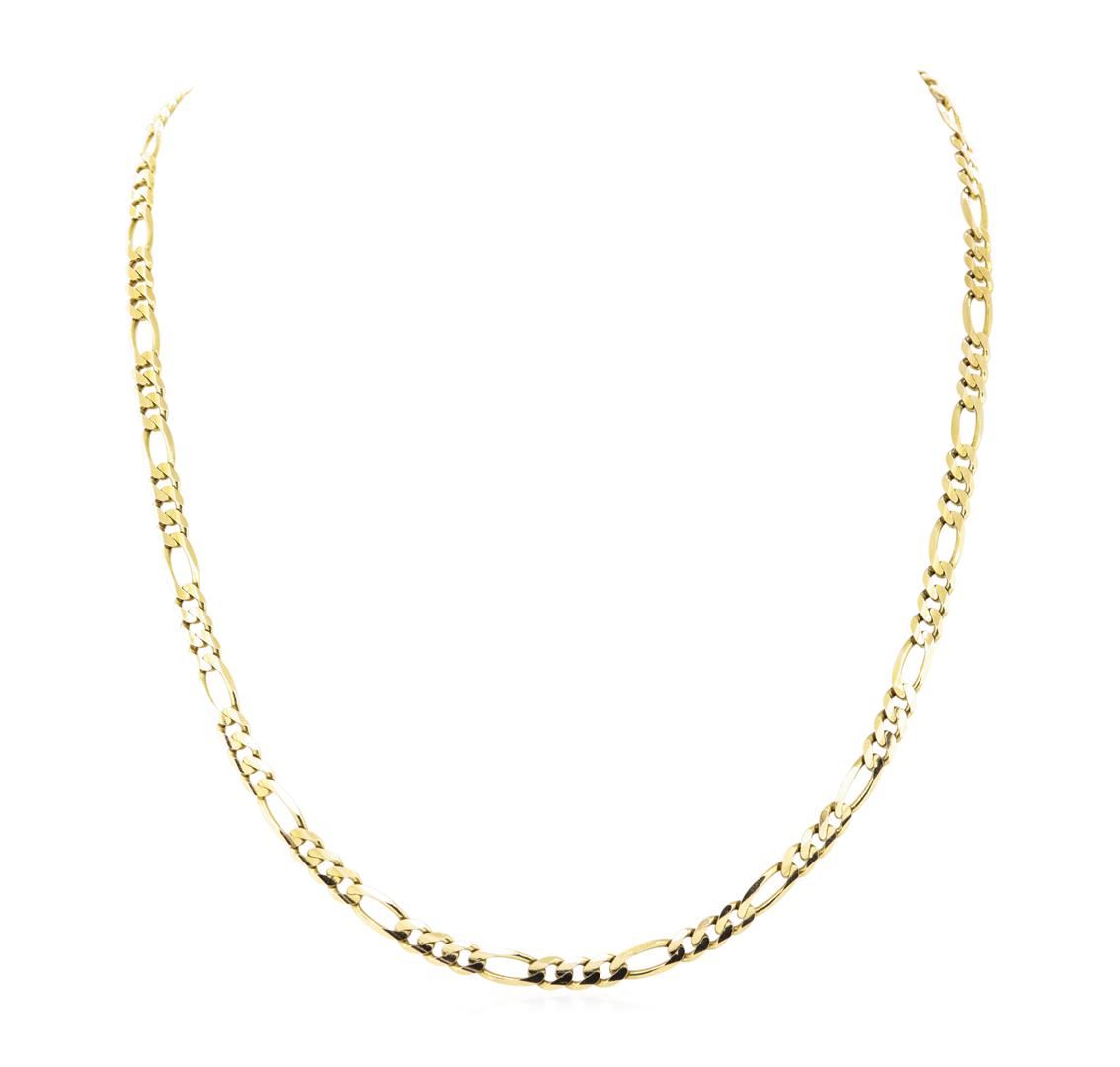 One 5.5mm wide figaro chain measuring 24 inches in length featuring: 14KT yellow gold weighing 29.7 grams.