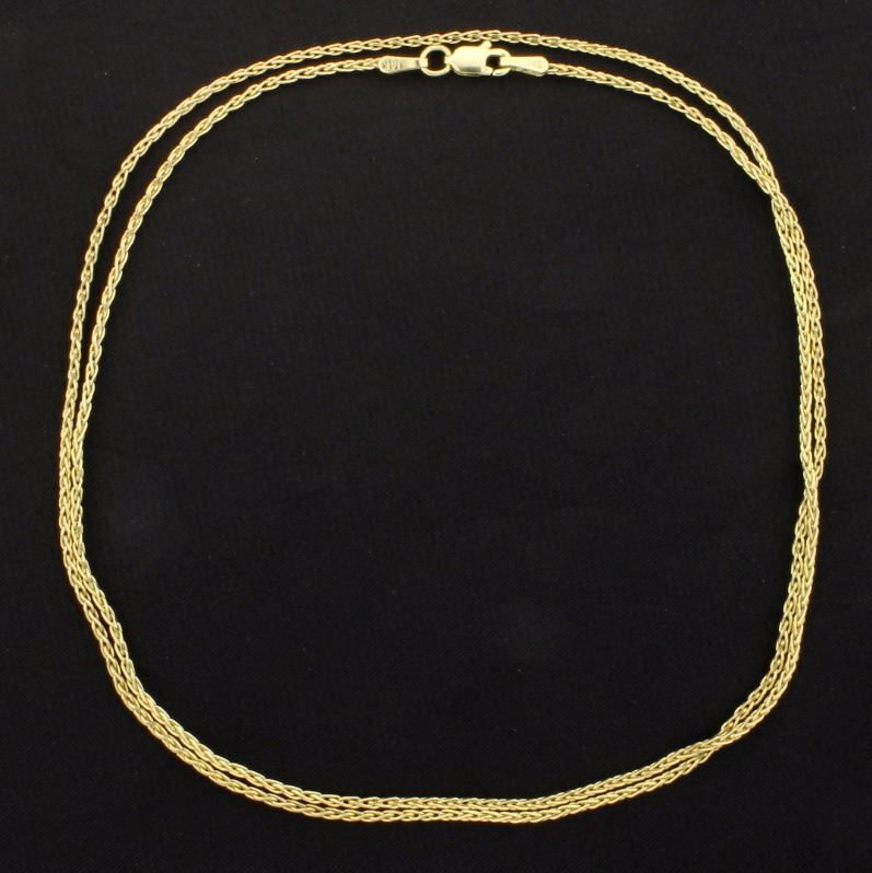 14K yellow gold, it is 1.5mm thick and has a lobster clasp. 5.9g