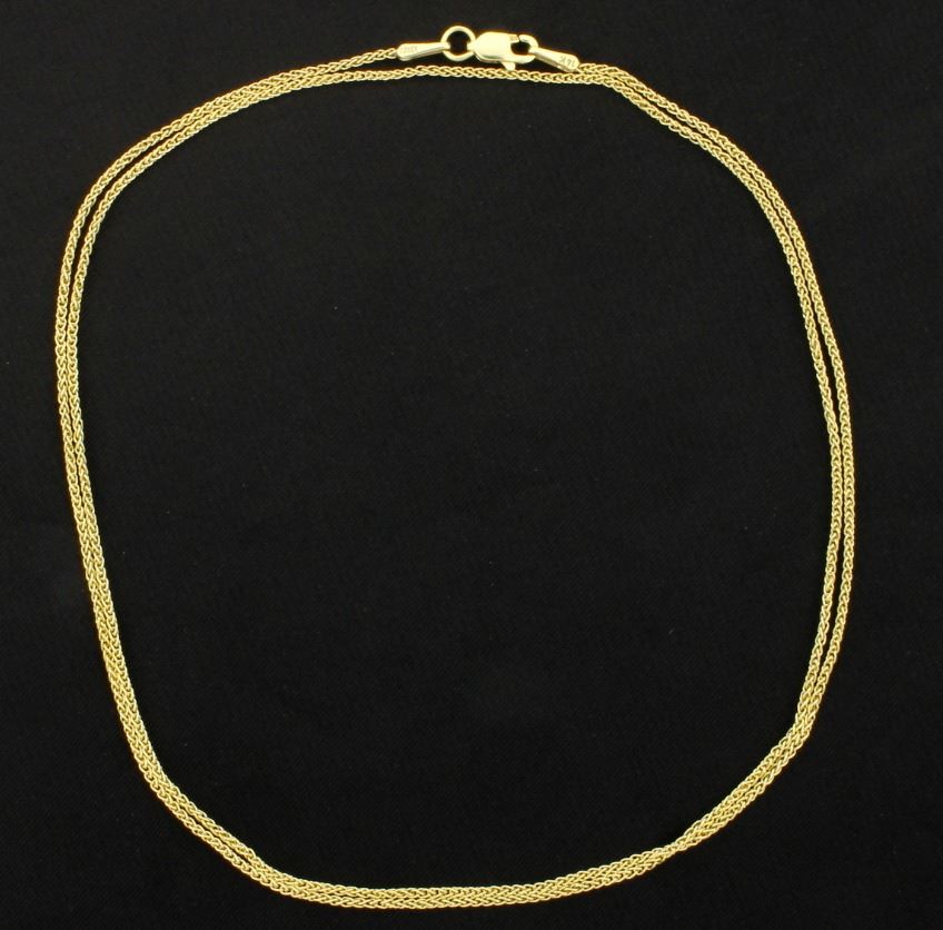 14K yellow gold, it is 1.2mm thick and has a lobster clasp. 3.7g
