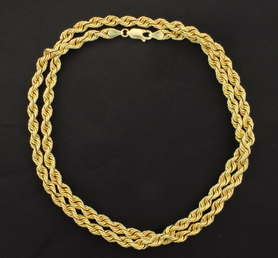 It is 10K yellow gold and is 4.9mm thick. 9.8g