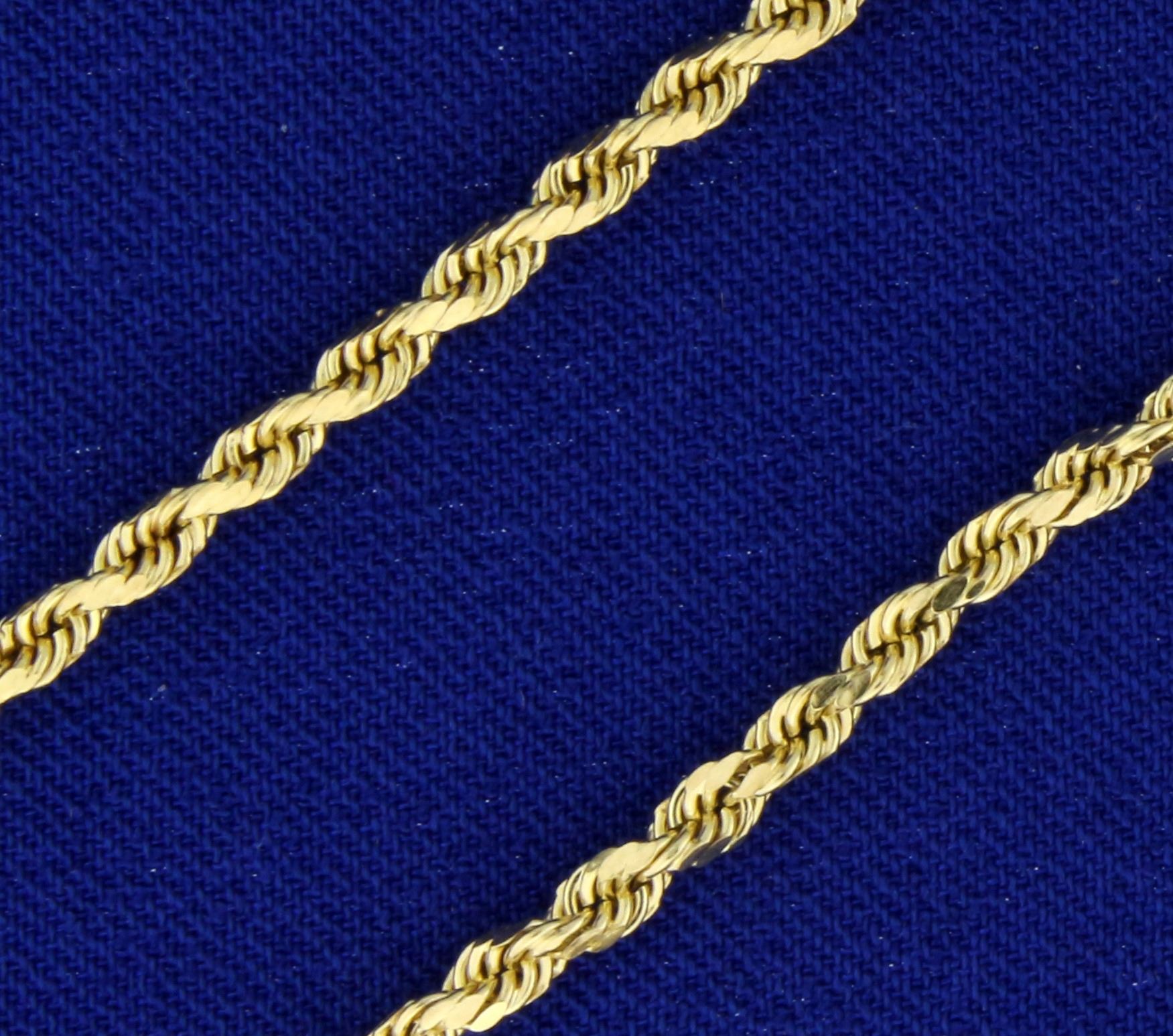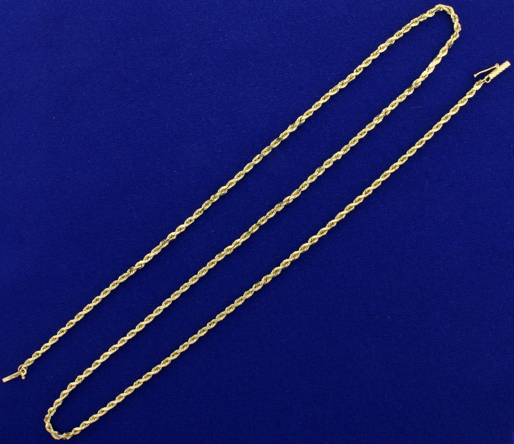 In 14K Yellow Gold. 24" long and 2mm wide, with safety clasp. 4.9g