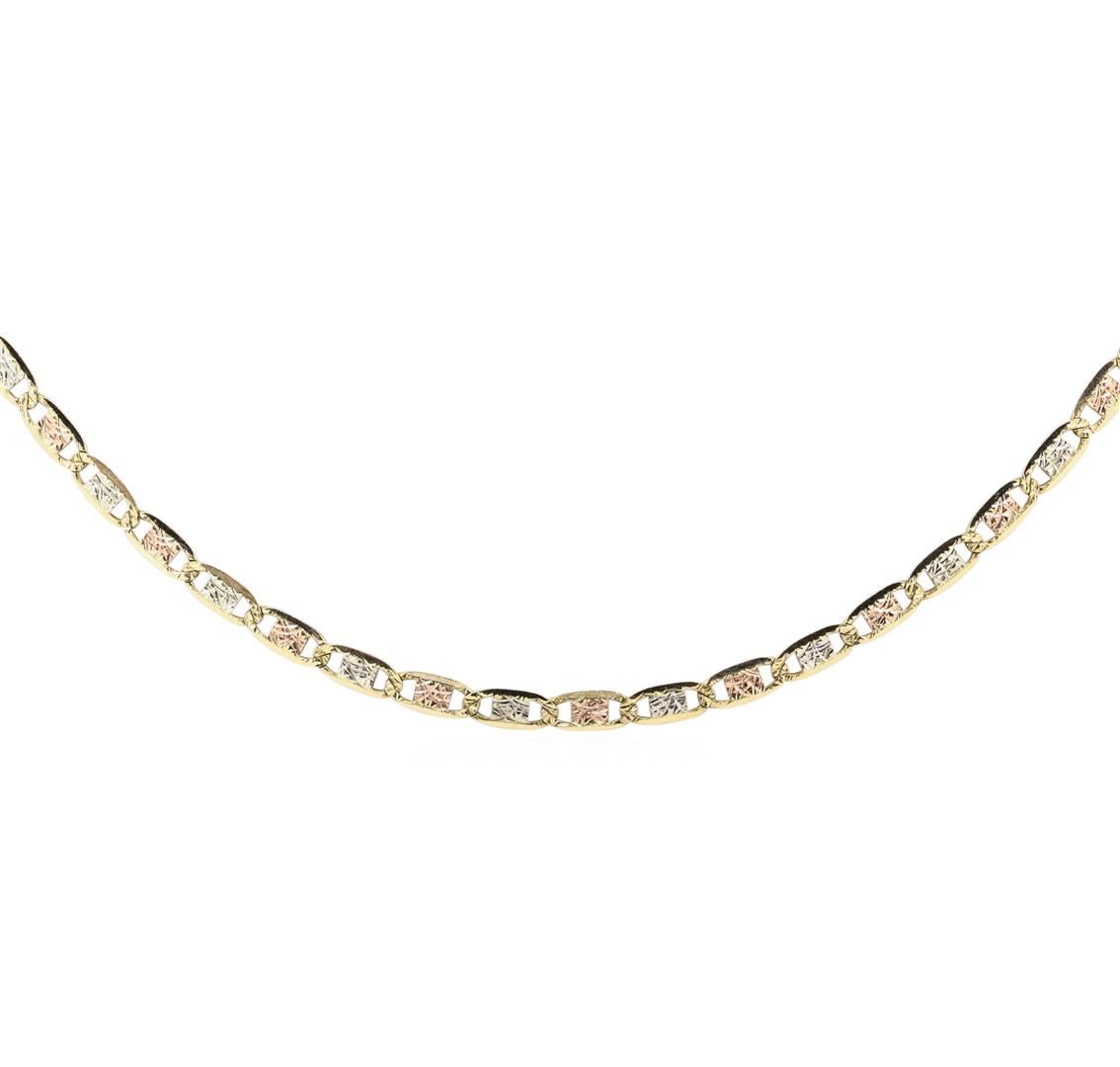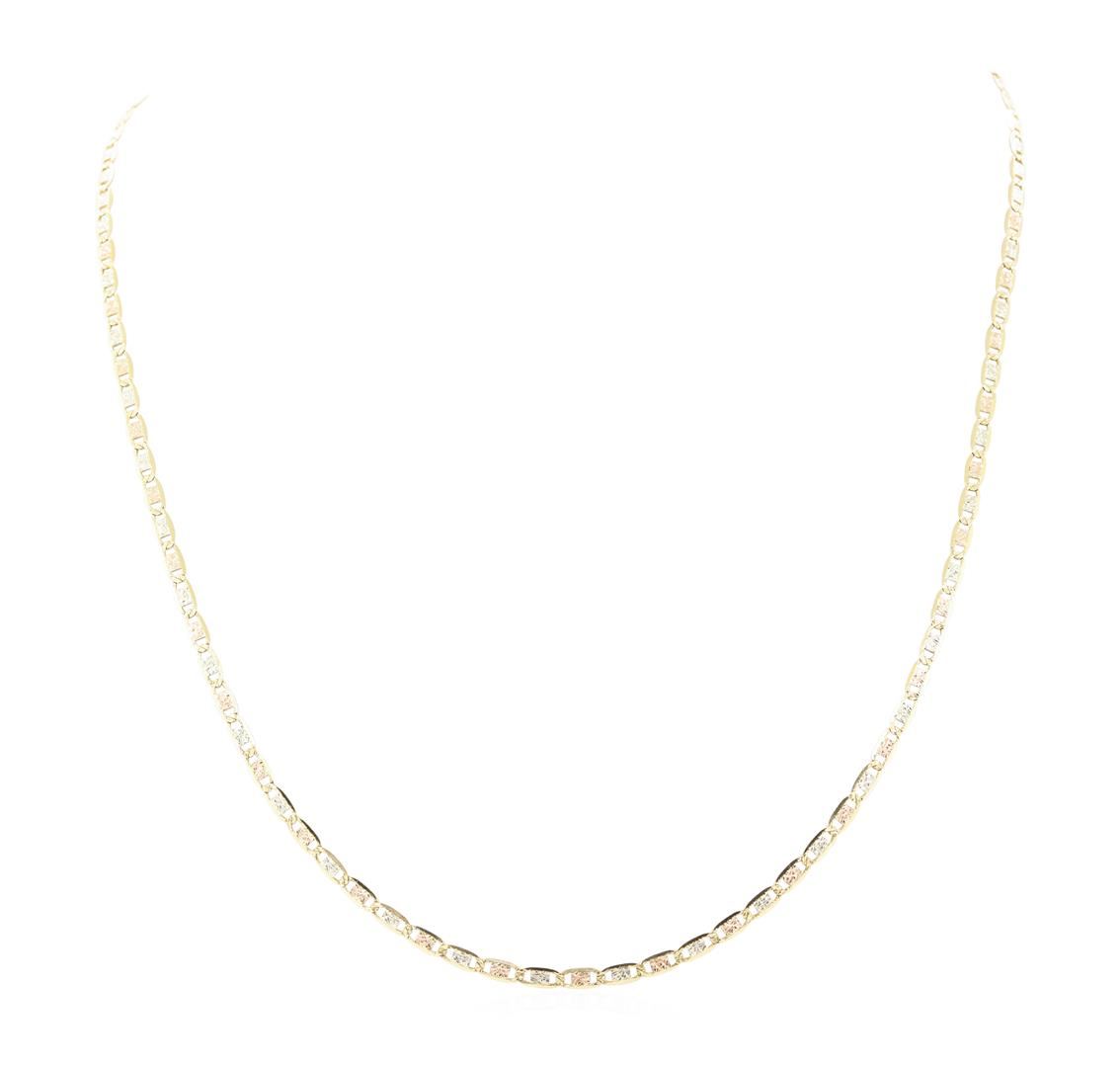 One 3.25mm wide Valentino chain measuring 24 inches in length featuring: 14KT rose, yellow, and white gold weighing 10.0 grams.