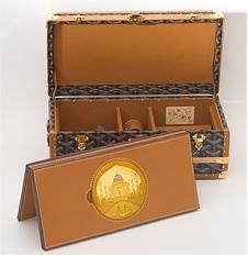 The 1 Kilo gold coin paying tribute to the Taj Mahal is displayed in an amazing packaging specially made by Goyard, official supplier to many Maharajas; the “Havana” leather and brown webbing of this trunk absolutely emphasize the brightness of this coin. It reminds the times of their splendor. Many accessories are included in this special trunk: a leather stand, a magnifier in a leather pocket, a special leather pouch for the coin, a key ring and gloves bearing Paris Mint logo. In addition a description of the Taj Mahal and the coin is printed in gold on a leather panel inside the trunk’s lid.