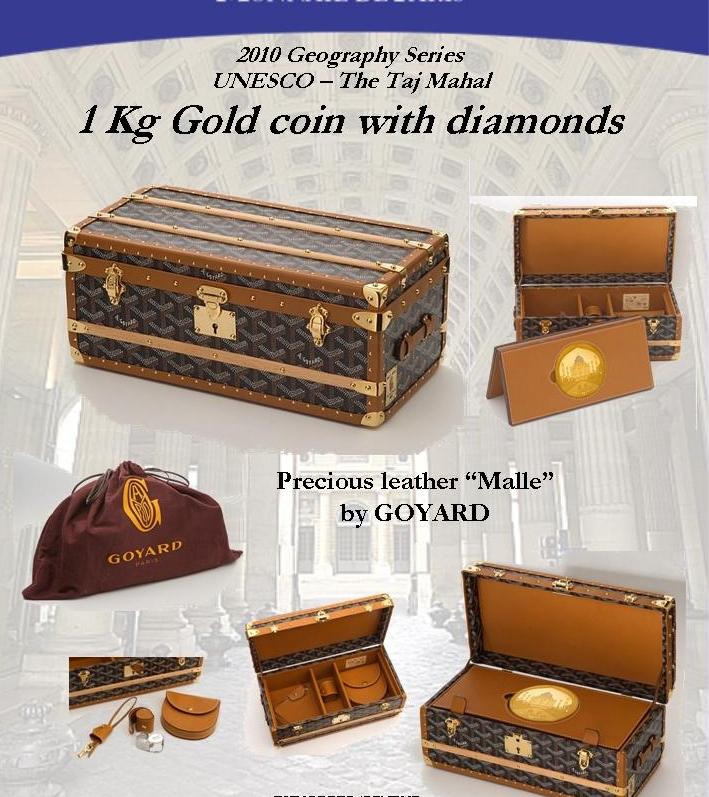 1 Kilo of 24 Karat Solid Gold Taj Mahal Coin/ Medallion With Cartier Diamonds and Packed in Trunk and Precious Leather Pouch by Goyard of London a tribute to this number 1 ranked UNESCO World Heritage site.