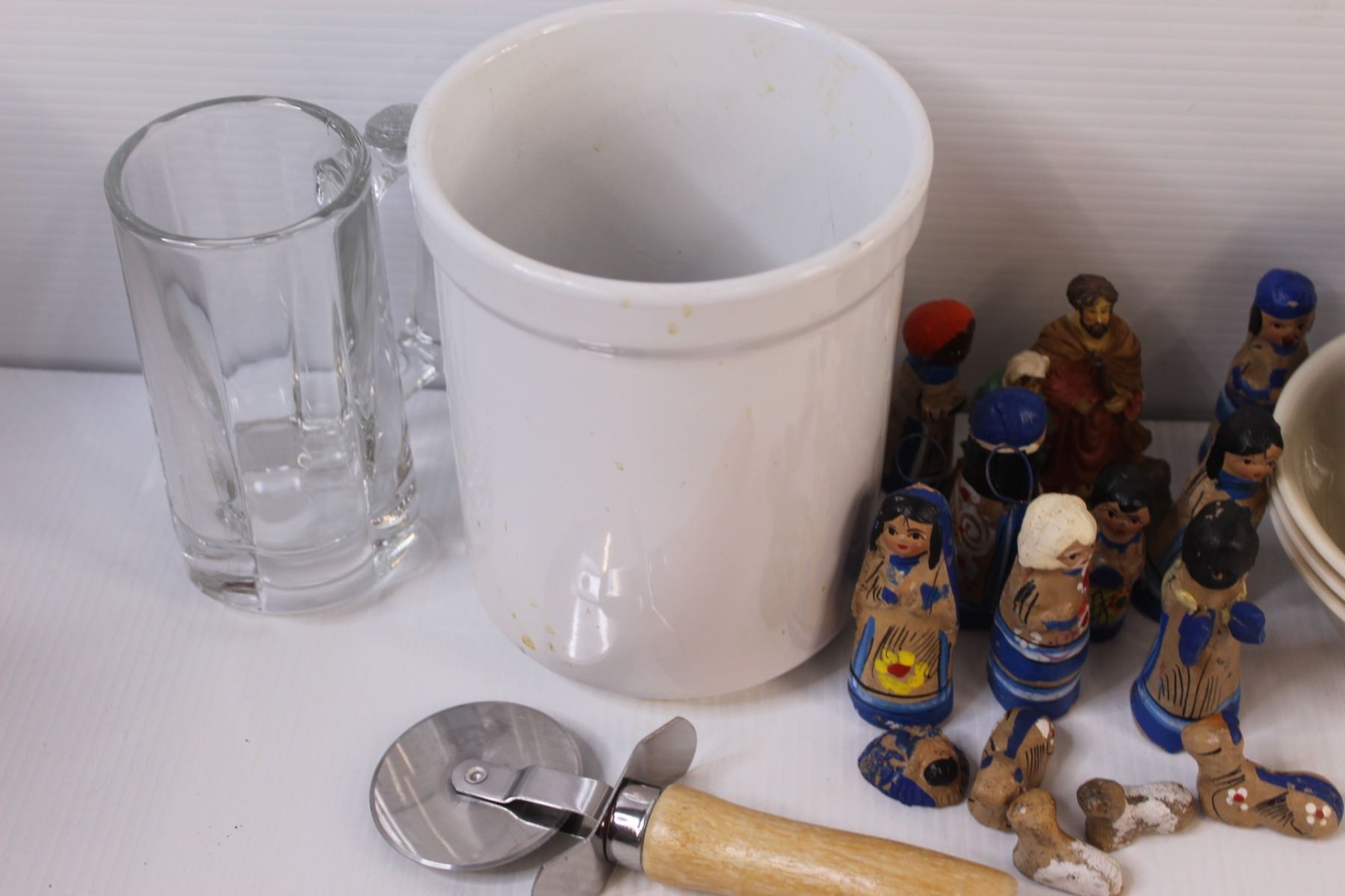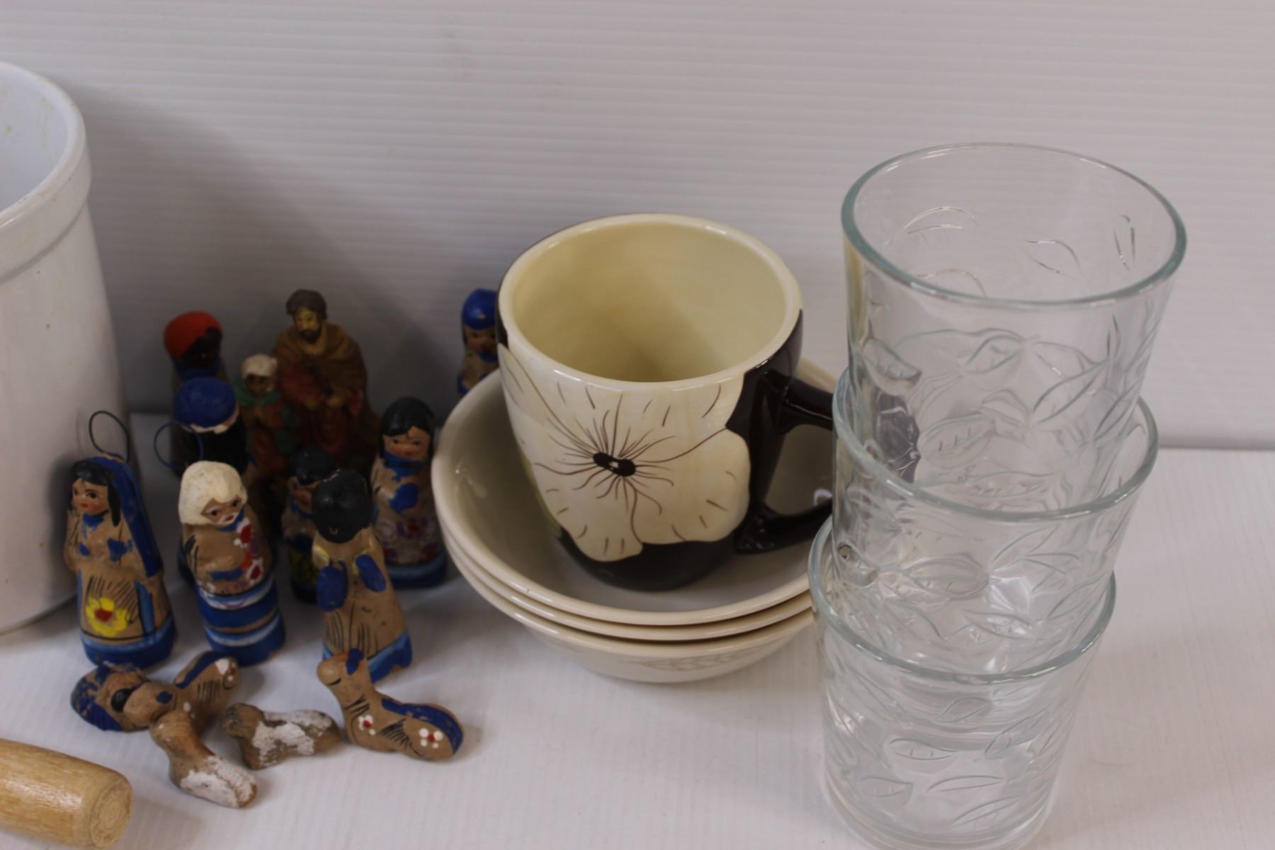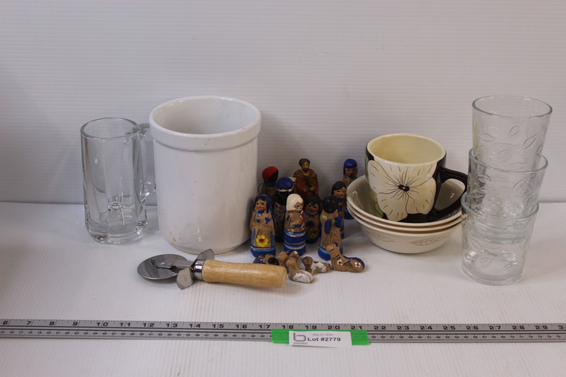 (24) Lot of Kitchenware: Glasses; Soup Bowls; Pizza Cutter; Nativity Scene & Misc.