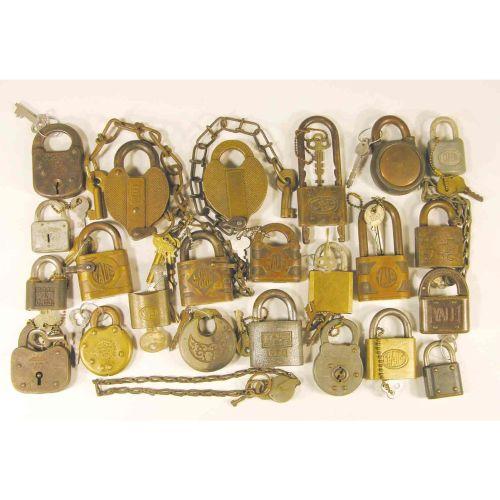 24 Misc. Padlocks including SO Company, Lock Wood, a Navy pancake style and an Auto Lock. Various sizes and conditions, all with keys.