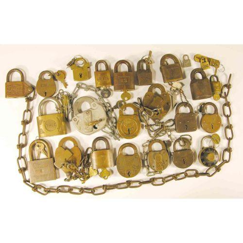24 Misc. Padlocks including Lion, Southern Pacific and R.Y.C. Various sizes and conditions, all but 3 have keys.