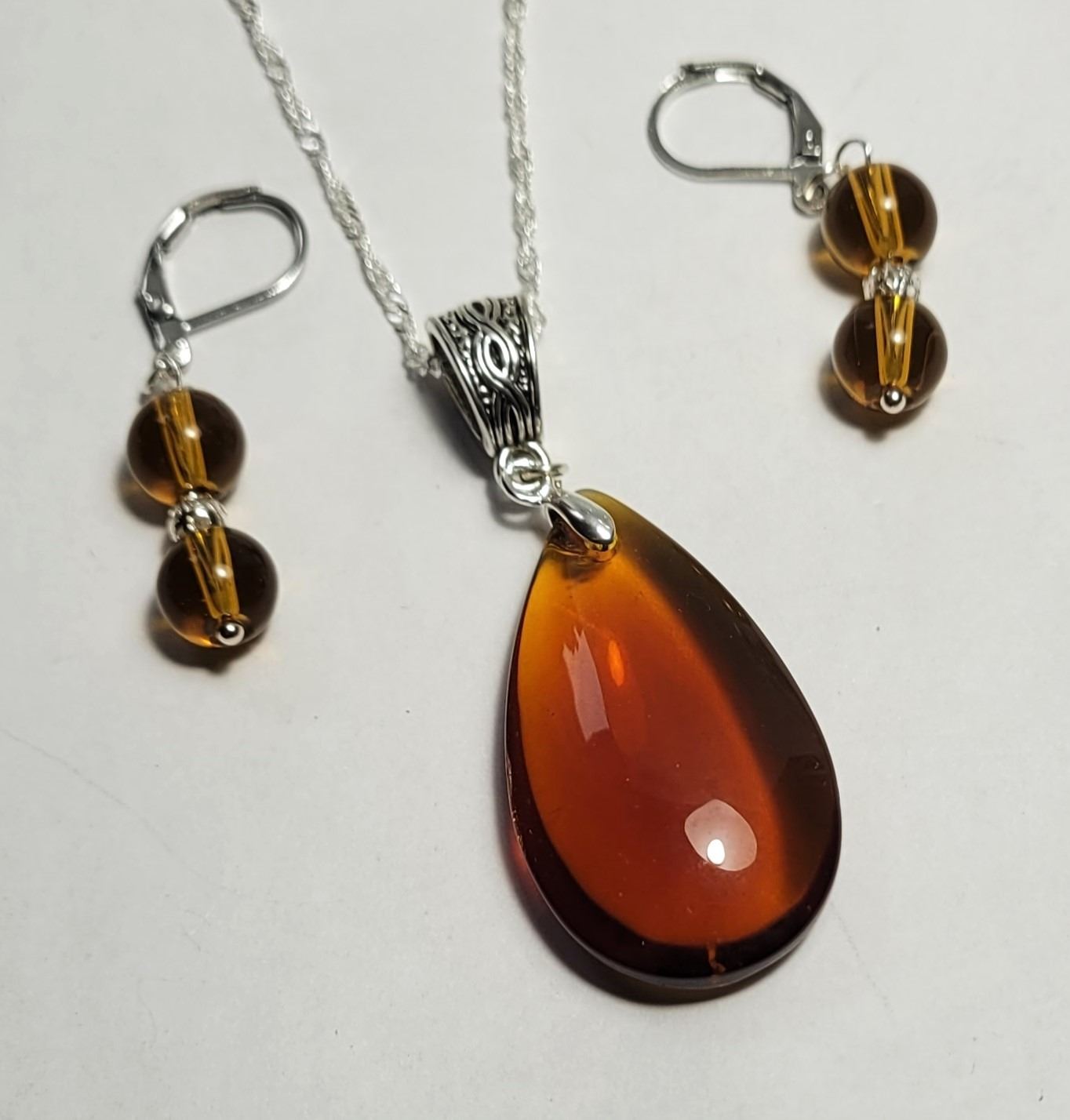 & EARRINGS ON LEVERBACK WIRES AND PENDANT ON 20" CHAIN. JEWELLERY