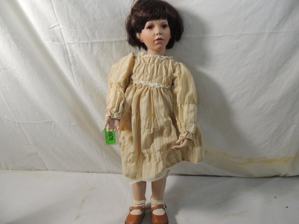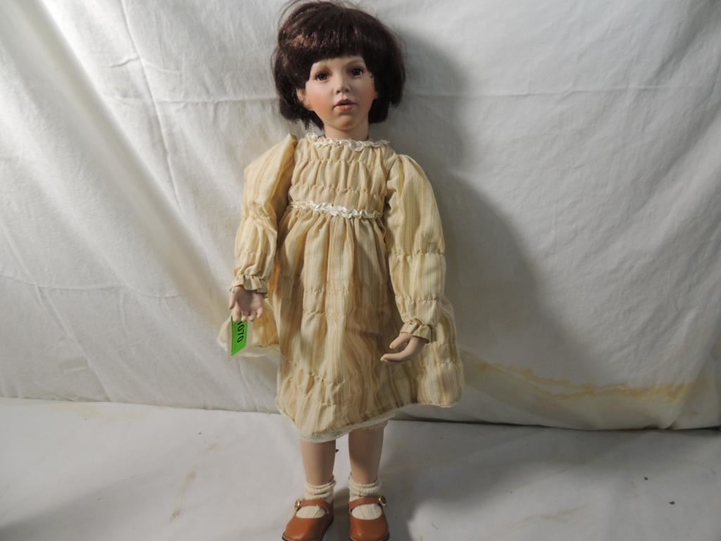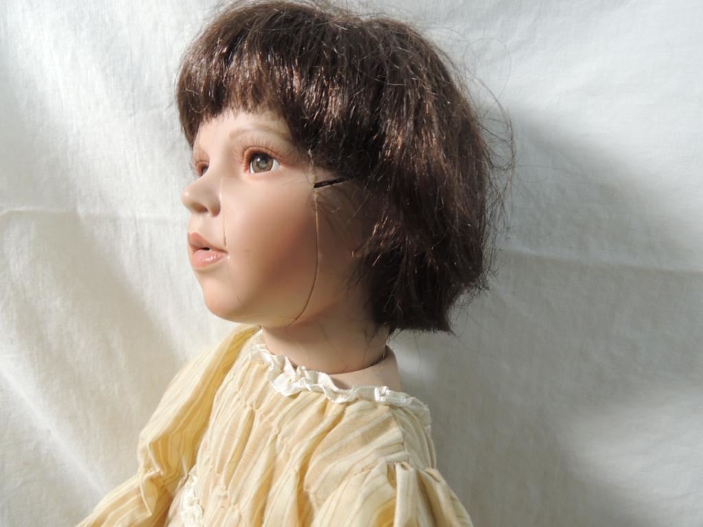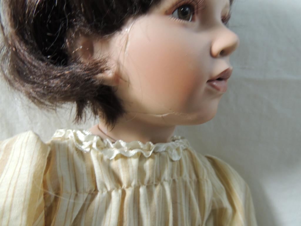 RETIRED DOLL, PARADISE GALLERY DOLLS DAMAGAED AND REPAIRED FACE HAND NUMBERED PORCELAIN DOLL. SHORT BROWN HAIR BROWN EYES CREAM AND TAN COLORED DRESS COLLECTIBLE AS SHOWN SEE PHOTO FOR MORE DETAILS.