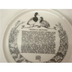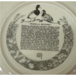 24 PIECE LYNN BOGUE HUNT BIRD DECORATED PLATE SET. Consists of 8 plates, 8 dessert plates, one salad plate, and 7 bread plates. All depict game birds and water fowl.