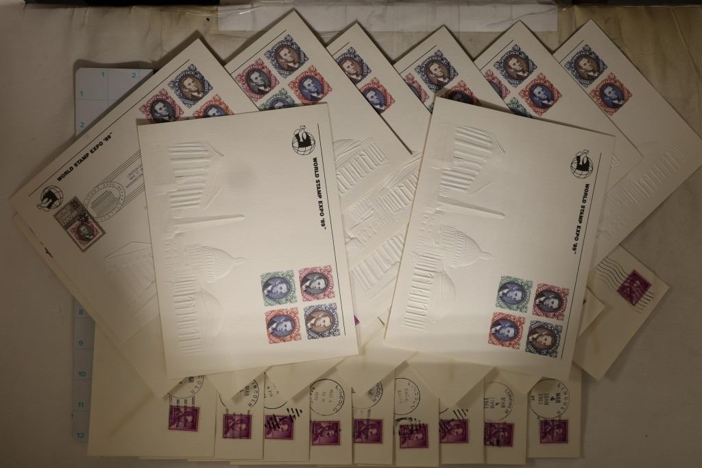8-WORLD STAMP EXPO SOUVENIR CARDS EACH FEATURING COLORIZED PHOTO OF 4-ABRAHAM LINCOLN POSTAL STAMPS AND EMBOSSED PHOTO OF LINCOLN MEMORIAL AND 16 CENTENNIAL INAUGURATION ENVELOPES WITH CANCELLED 4 CENT