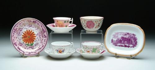 24-PIECES OF EARLY PINK LUSTRE CHINA. Lot consists of: Seven cups and saucers; four extra cups; 3in. h x 4-1/2in. open sugar bowl; two 8-1/4in. plates; 7-1/2in. plate; 7in. plate; 7-1/2in. x 6in. transfer dish (decorated with borough and family). Cups and saucers are pink lustre and decorated with flowers. CONDITION: Generally very good. 9-26011