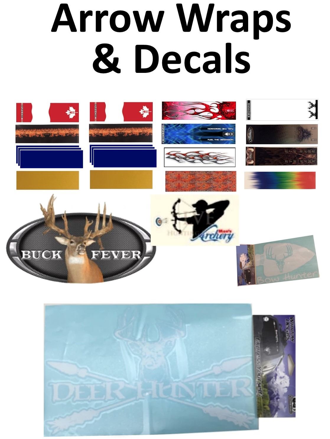 24 Packages of Arrow Wraps and Decals, 4" Carbon Red Rusted Flame Wrap(1), Wrap 4" Carbon, Blue X-Ray HD(1), Wrap 4" Carbon, Mathews Big Game(1), Wrap 4" Carbon, Mathews Deer Skull(1), Standard White Deer Wrap 4"(1), Standard Canadian Flag Wrap 4"(2), Decal Buck Fever Full Color(1), Decal Deer Hunter White 7.5x12(1), Flaming Metal Arrow Wraps(1), Dualing Flames Arrow Wraps(1), Flux Arrow Wraps(2), Techno Fade Arrow Wraps(1), Decal Bowhunter Arrowhead White 4x6(1), Men's Archery-Compound Bow(1), Dark Blue Arrow Wraps(6), Metallic Yellow Arrow Wraps(2),