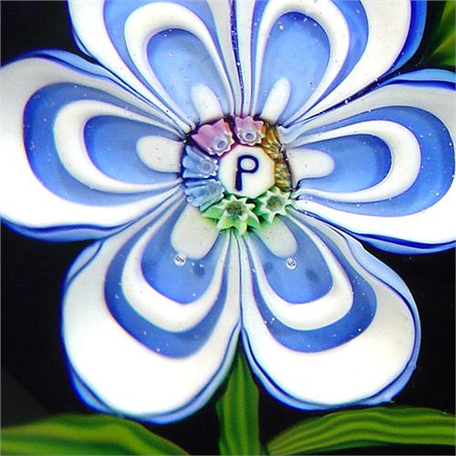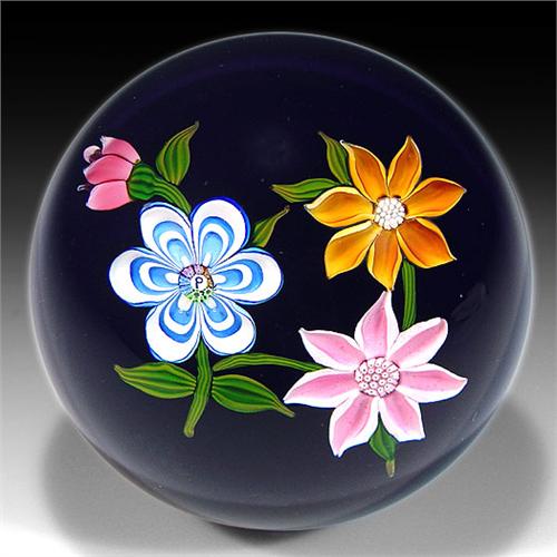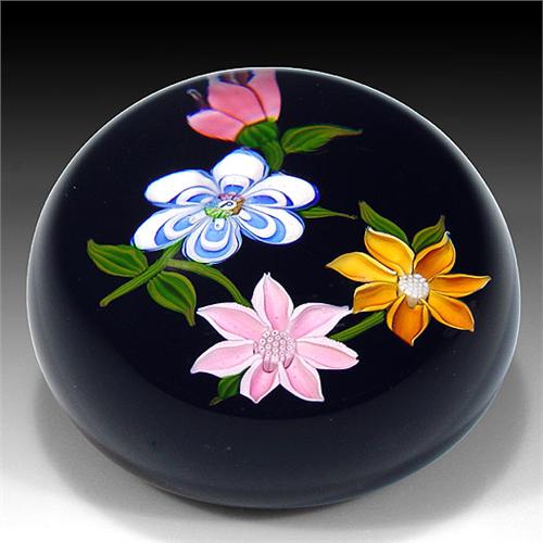 Perthshire Paperweights 1978 three-flower bouquet on black ground paperweight. The piece contains three lampwork flowers, a bud, and green leaves, on black ground. Signature cane in the center of one of the flowers. Limited edition of 350. Edition #302, with certificate. Diameter 3". NO RESERVE