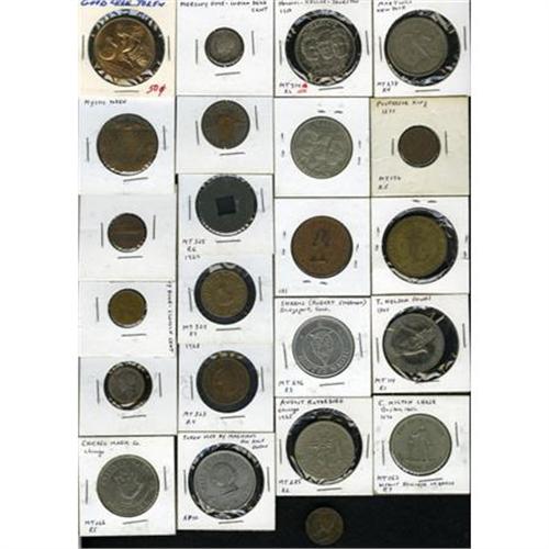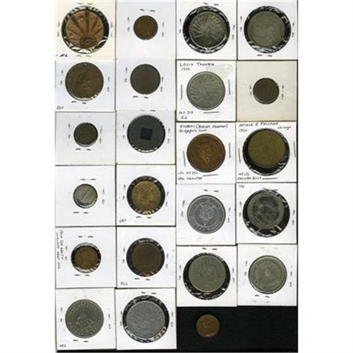 <B>24-Piece Lot of World Magician's Tokens.</B></I> Another group lot of magician's tokens, listed by their TAMS catalog numbers and known rarity designation: <B>MT-063 no bull's eye, R.7; MT-066, R.5; MT-114, R.1; MT-133 in brass, unlisted; MT-196, R.5; MT-238, R.4; MT-285, R.2; MT-296, R.3; MT-296 with a George Washington reverse; MT-314, R.2; MT-314a, R.2; MT-323, R.4; MT-324, R.4; MT-325, R.6; </B></I>and<B> nine other pieces.</B></I> This lot should also pique the interests of magician's token collectors worldwide.<BR><BR><b>Shipping:</b> Coins & Currency (<a target="_blank" href="http://www.heritageauctions.com/common/shipping.php">view shipping information</a>)