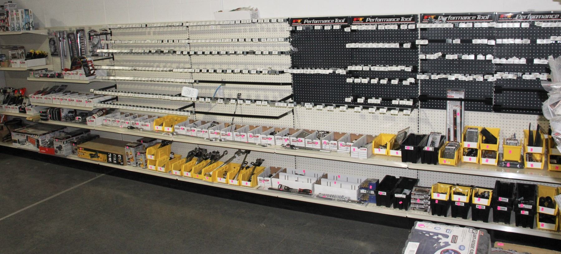 INCLUDES SHELVES AND PEGS SHOWN IN PICTURE. NO OTHER CONTENTS INCLUDED. SINGLE SIDED UNIT
