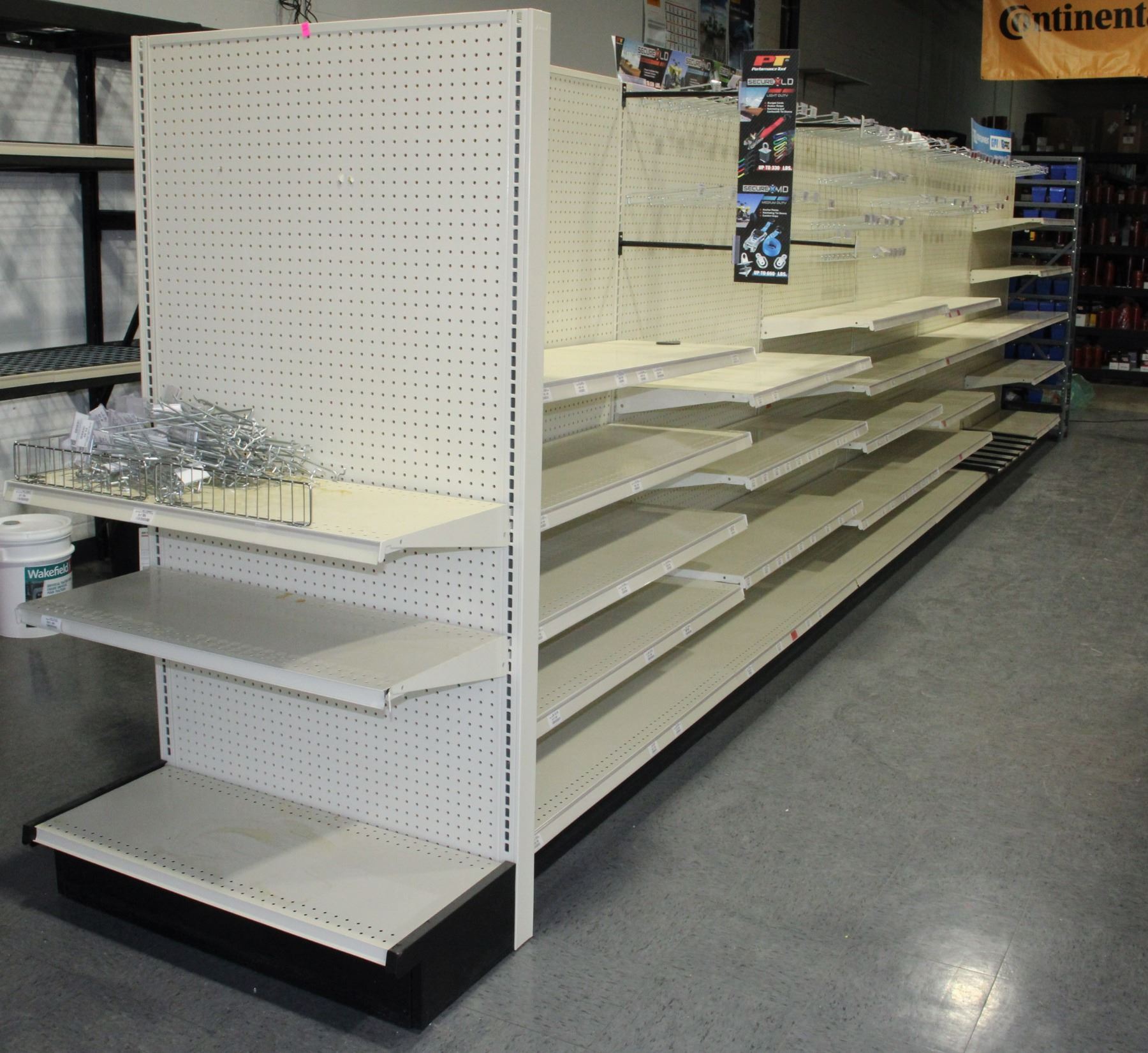 ALL SHELVES/ PEGS SHOWN INCLUDED. NO OTHER CONTENTS INCLUDED. SINGLE ENDCAP NOT INCLUDED IN MEASUREMENTS