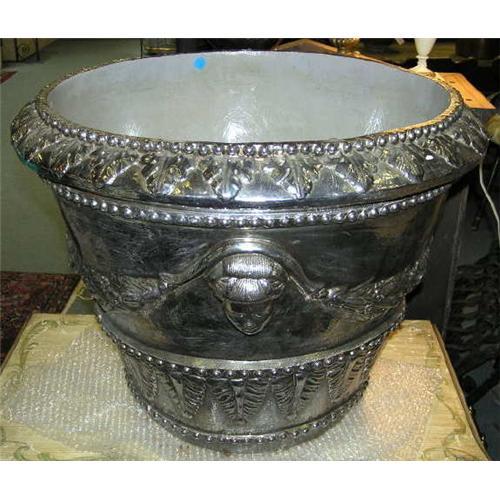 This terracotta planter with silver leaf finish measures 24" across and 19" high and weighs an estimated 40-60 lbs. Features neoclassical swags and cherub masks in high relief. Overall condition is good, but there are up to a dozen or so chips to the finish where the terracotta is revealed. There is also some sticker paper/glue reside in a few areas. Age is unknown. Silver leaf finish appears to have been restored in one area approximately 6-8" across along the rim. This item resides in Red Bank NJ and may be seen by appointment.