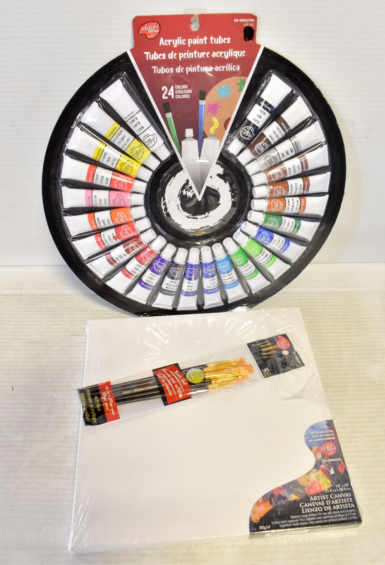 24 TUBES OF ACRYLIC PAINT, BRUSHES + CANVAS