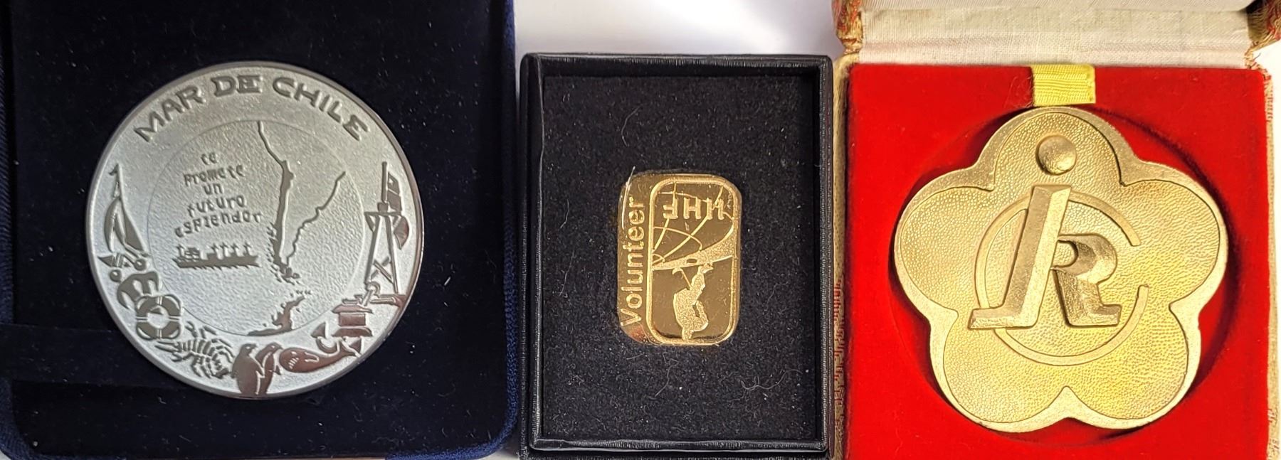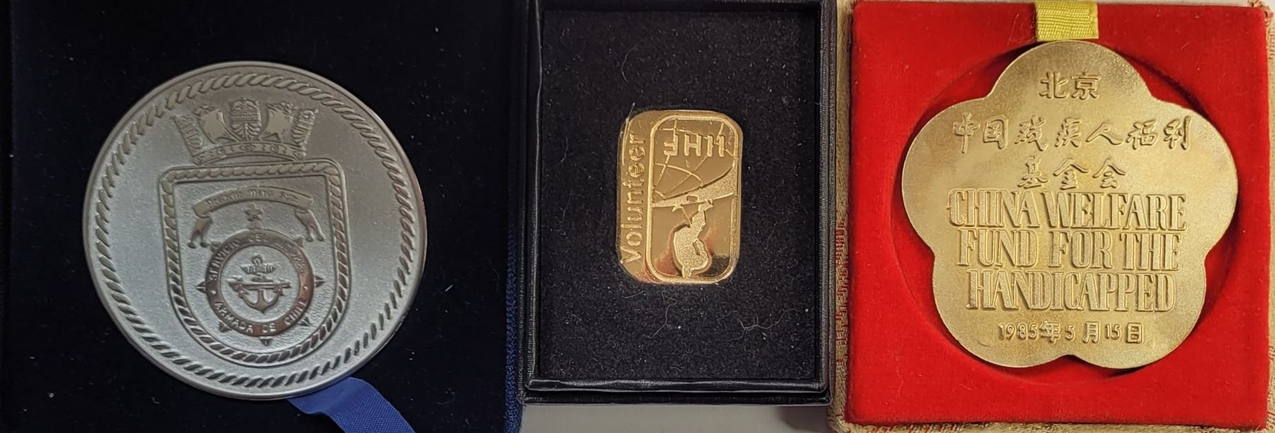 HOCKEY FEDERATION, MAR DE CHILE NAVEL TOKEN & CHINA WELFARE FOR THE HANDICAPPED MEDAL FROM 1985, ALL IN PRESENTATION BOXES. COLLECTIBLES