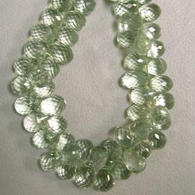 GREEN AMETHYST BRIOLETTE STRAND. IT WEIGHTS 240 CTS. EACH BEAD MEASURES 11x8 MM APPROX. INCLUDED. TOP DRILLED