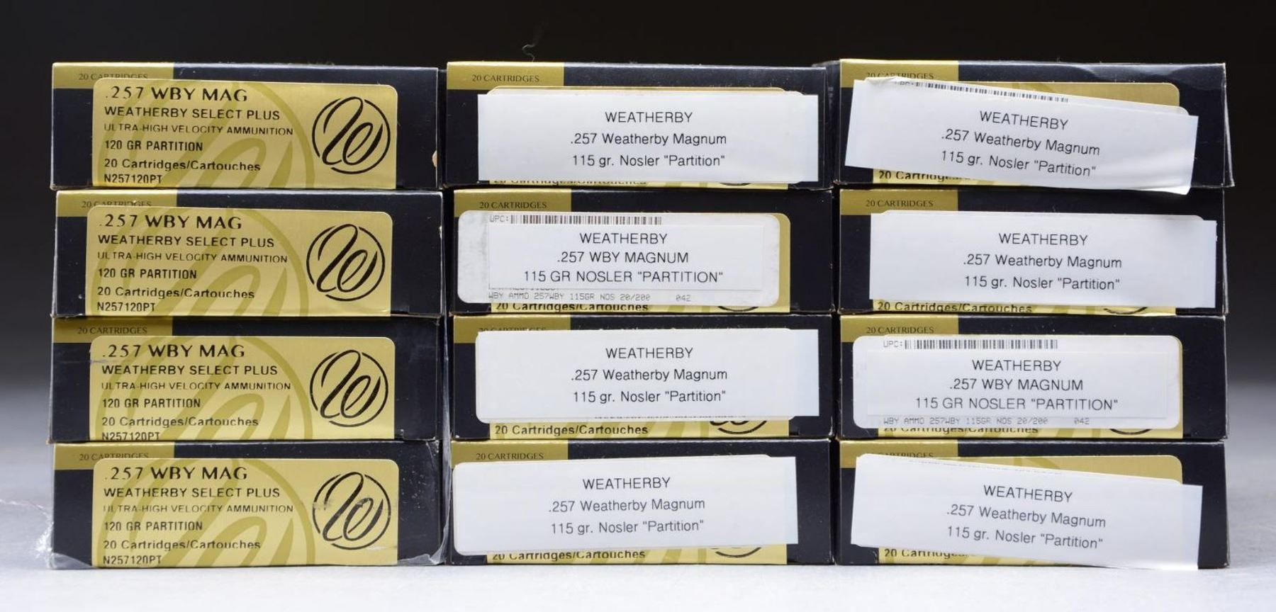80 RDS. (4 BOXES) 120 gr. Partition. 160 RDS. (8 BOXES) 115 gr. Nosler Partition. CONDITION: boxes near excellent & ammo appears serviceable. PROVENANCE: The Collection of Gun Sport Ltd owned by Jon R. Thomas. (02-20290/MD). $600-1050.