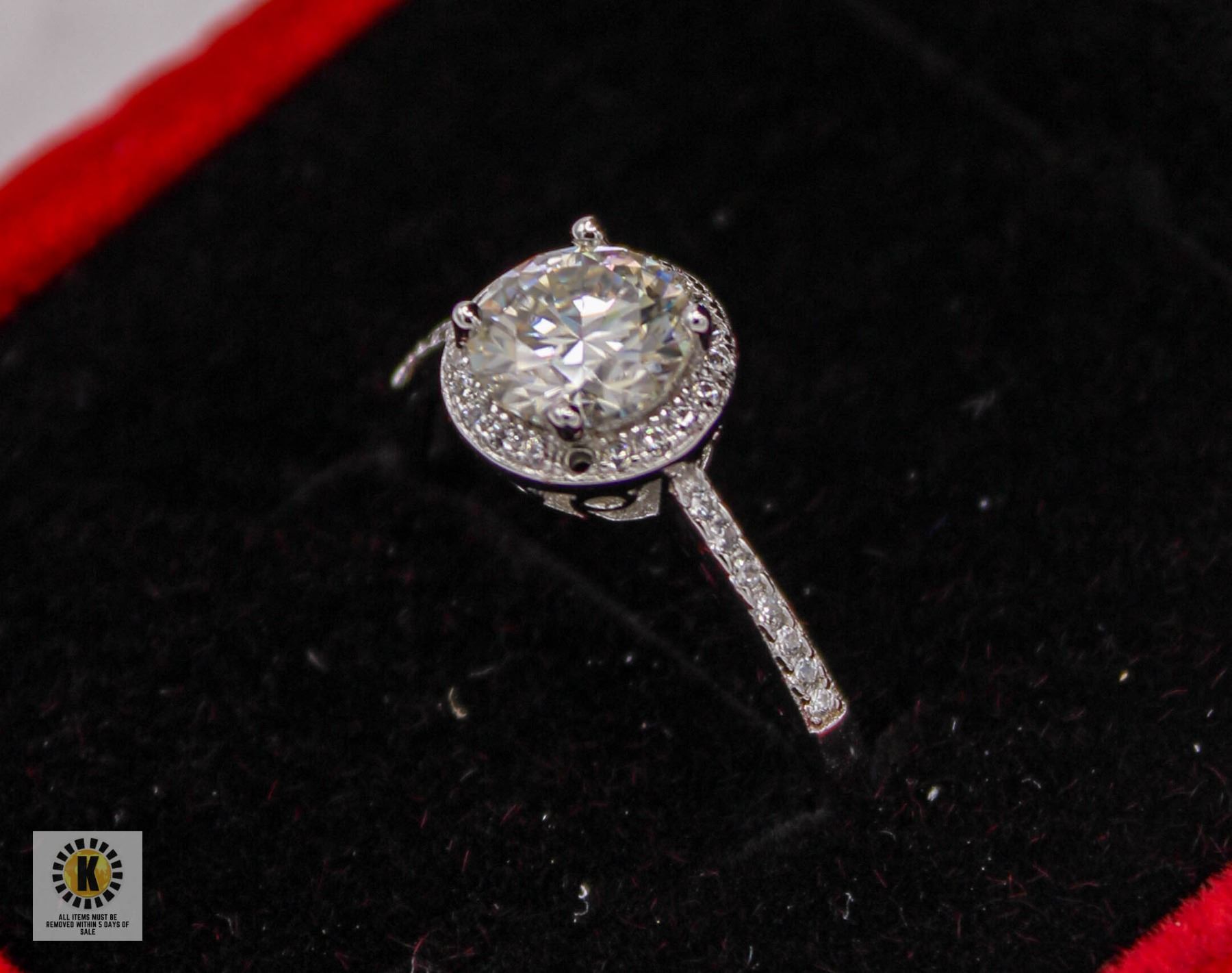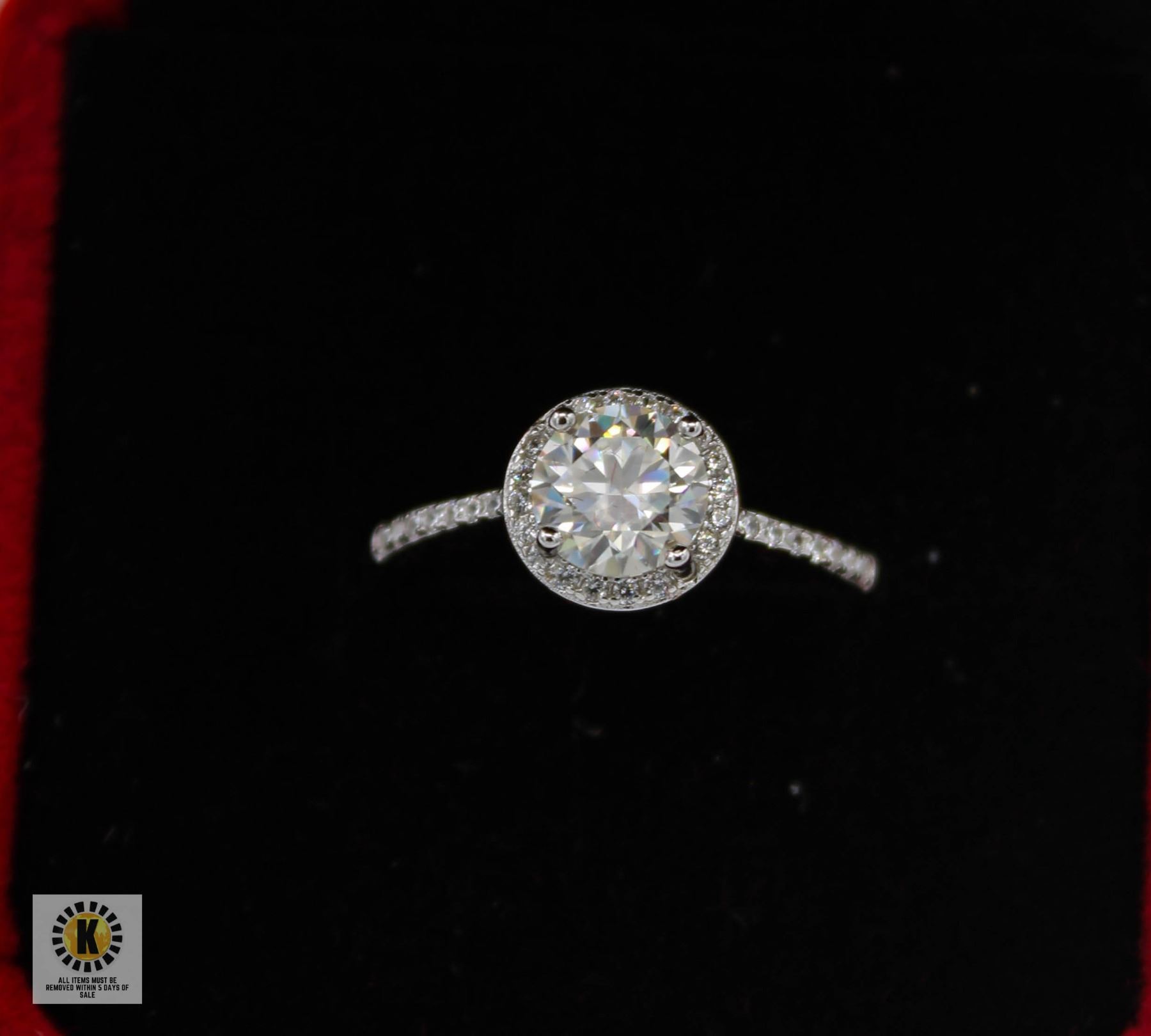 MOISSANITE STONE VVS D COLOR WITH 35 ROUND BRILLIANT CUT CUBIC ZIRCONIA SET IN ROUND HALO WITH SOME SET IN SHANKS SET IN 925 SILVER RING SIZE ADJUSTABLE **ALL ITEMS MUST BE REMOVED BY 5PM SATURDAY, APRIL 5TH 2025. ALL REMAINING ITEMS WILL BE SUBJECT TO A $6.00 PER DAY STORAGE CHARGE. ANY ITEMS REMAINING AFTER MONDAY, APRIL 21ST 2025 WILL BE CONSIDERED FORFEITED. NO REFUNDS WILL BE ISSUED FOR FORFEITED ITEMS. TO SCHEDULE A PICK UP APPOINTMENT CLICK HERE