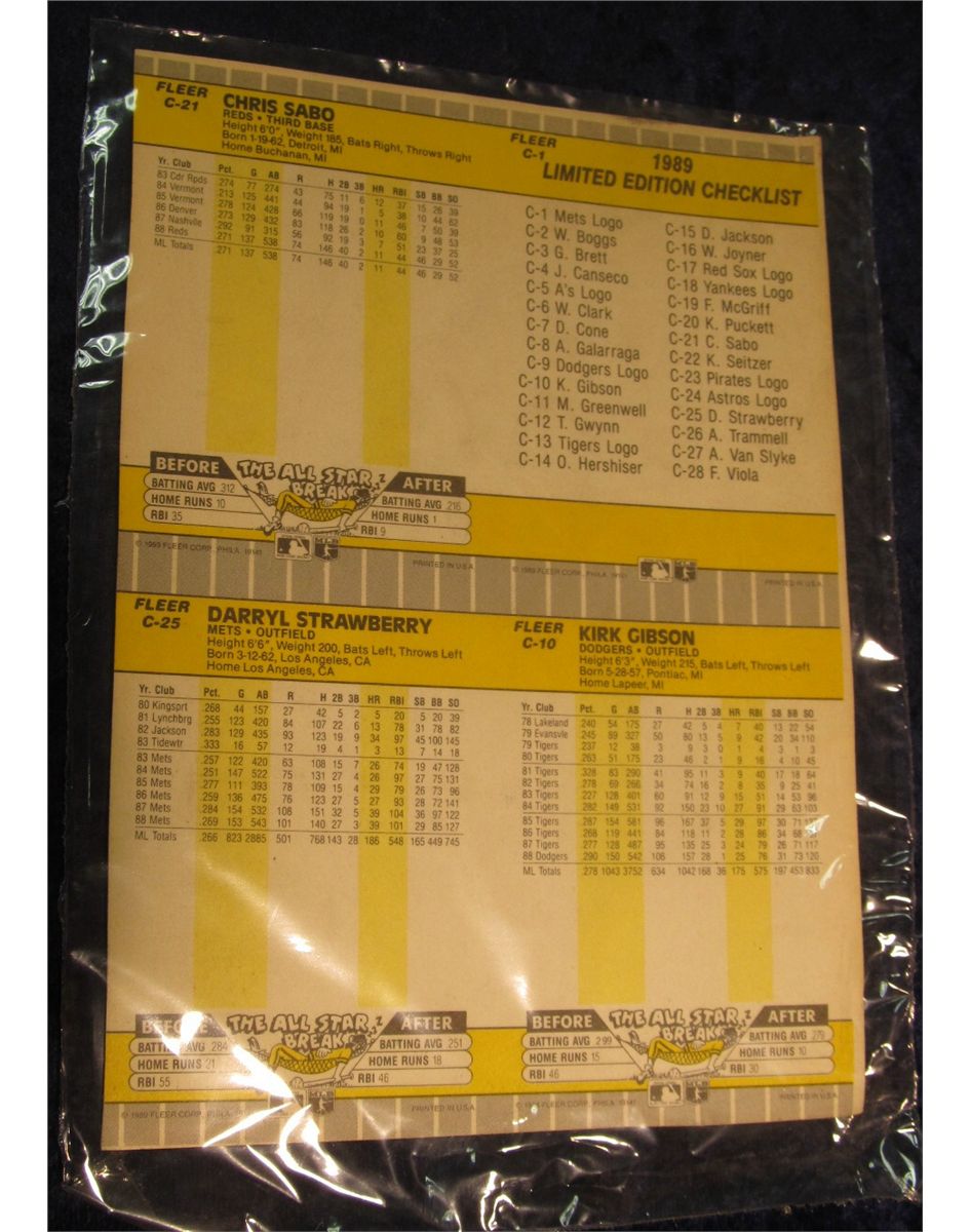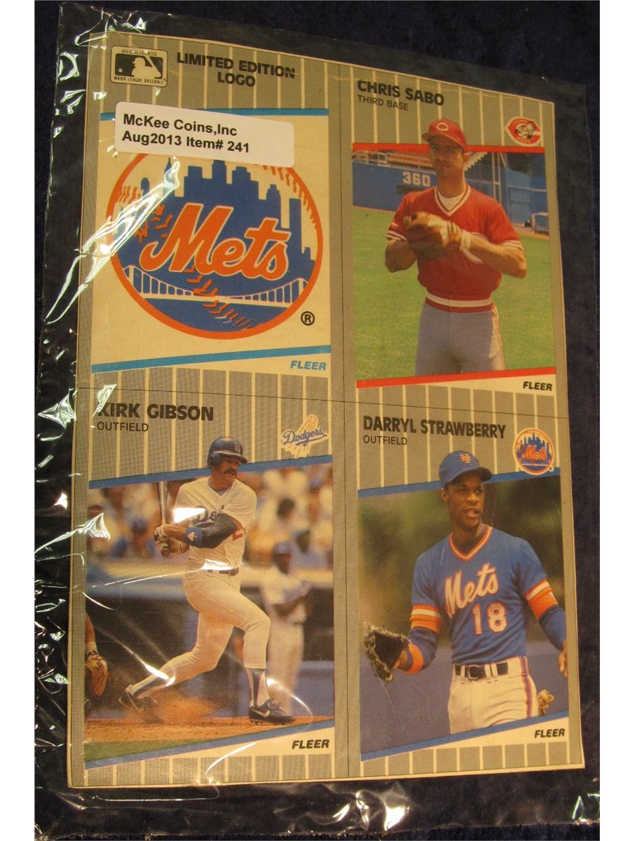 241. 1989 Fleer Uncut Sheet of four Baseball Cards. Includes Limited Edition Logo; Chris Sabo; Kirk Gibson; & Daryl Strawberry.
